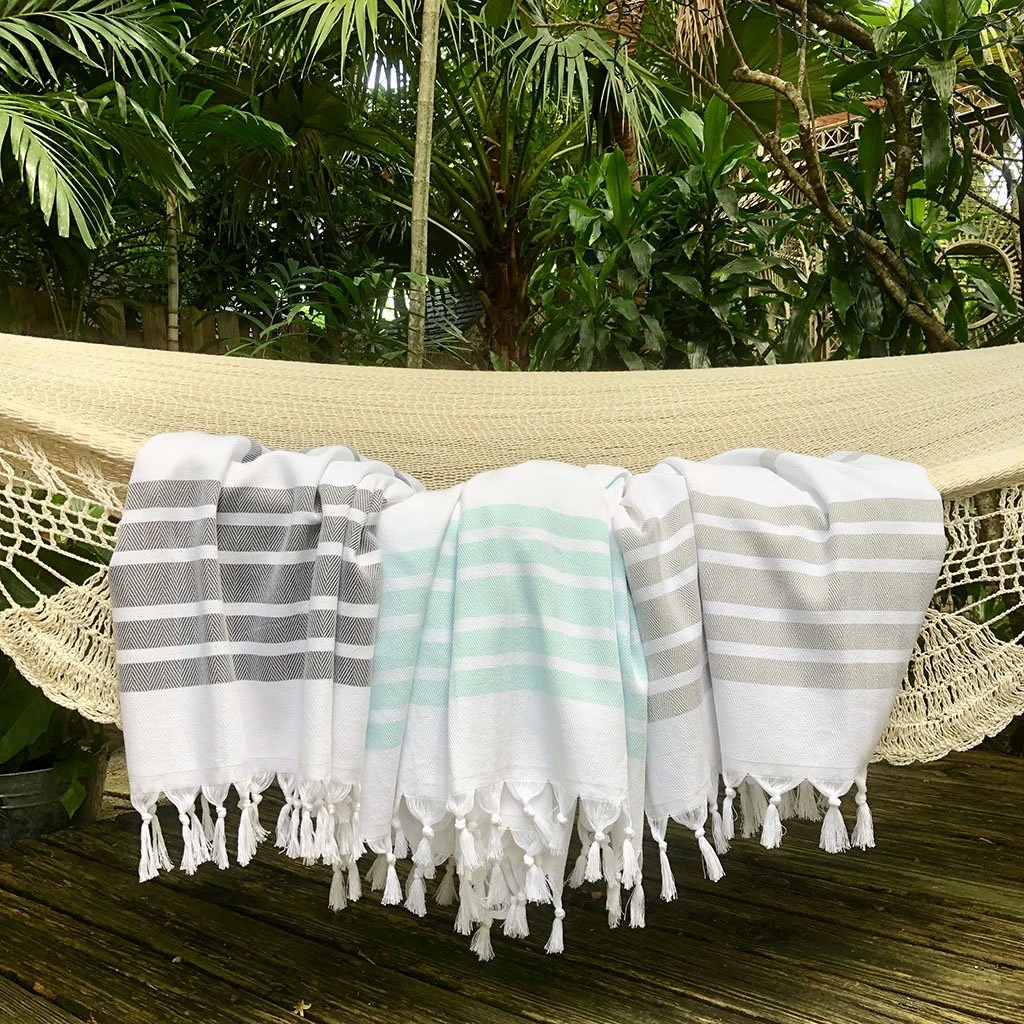 Our Turkish towels are loomed by small, family owned workshops in the Denizli region of Turkey. Weaving is the main source of income for these skilled weavers, who pride themselves on keeping the looming tradition alive, utilizing manual craftsmanship without compromising quality. They only use eco-friendly, OEKO-TEX certified, 100% natural fibers such as cotton and bamboo and colors are achieved through non-harmful dyes. Tassels are hand-knotted by women in their homes.