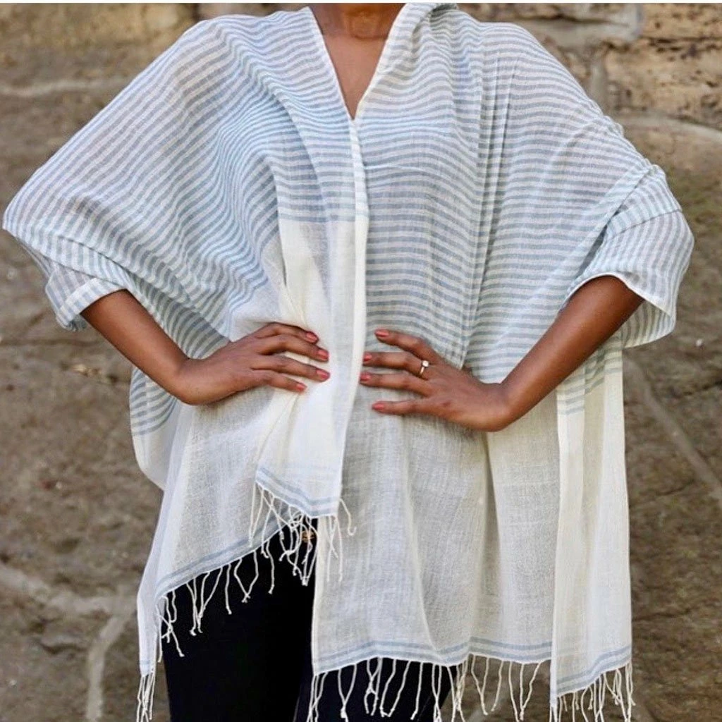 This lightweight scarf is made of pure Ethiopian cotton. It emulates the scarves and shawls most Ethiopian women wear on holidays and special occasions. The soft colors and airiness of these scarves make them perfect for spring and summer. Available in 3 colors!