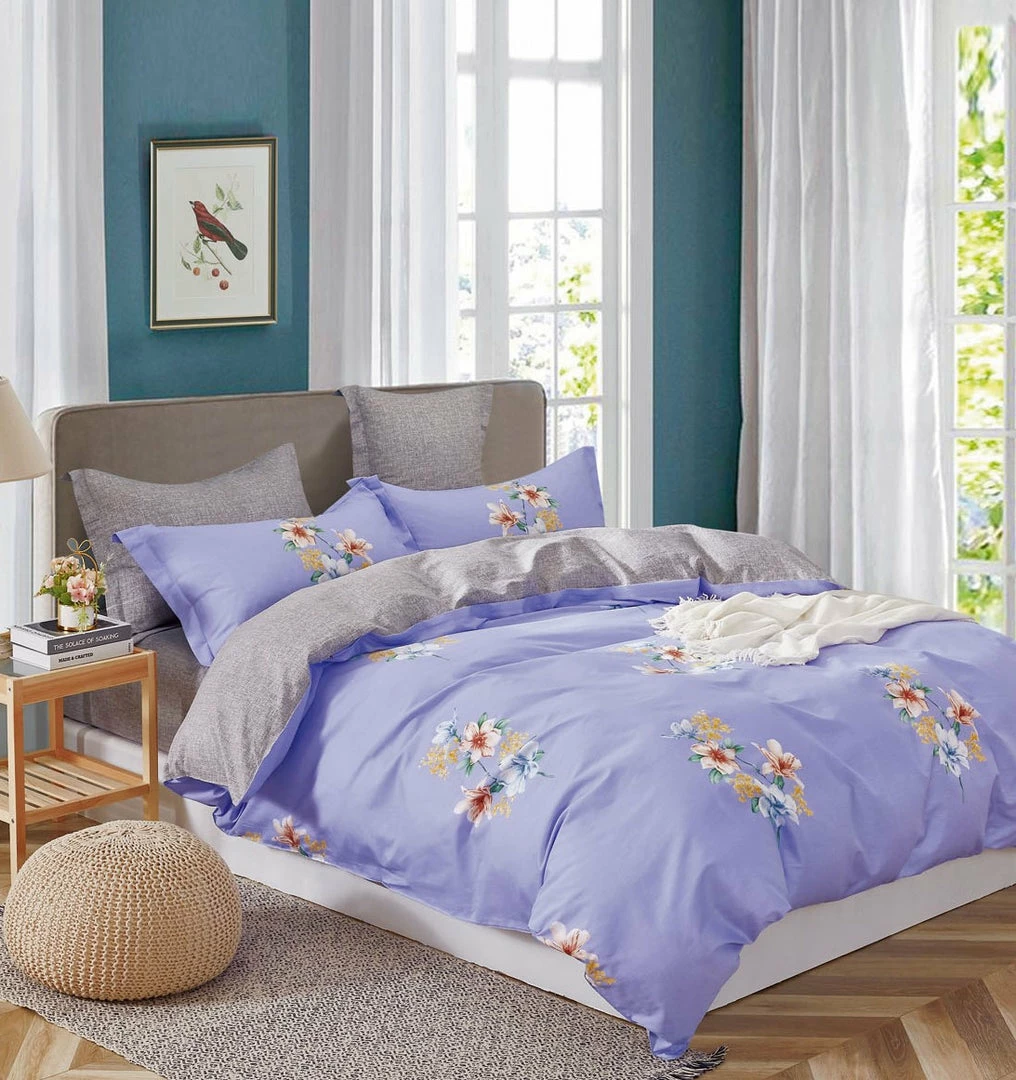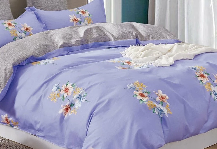 Make a quick and colorful makeover to your bedroom with the Kaufman Lily Purple Floral 100% Cotton Reversible Comforter Set. The medium shade purple with complementing grey reverse side makes for a nice balance between feminine and masculine appeal. This well made 100% natural cotton print shell has a 100% down alternative poly fill. Available in King, Queen/Full, and Twin XL with matching pillow shams.