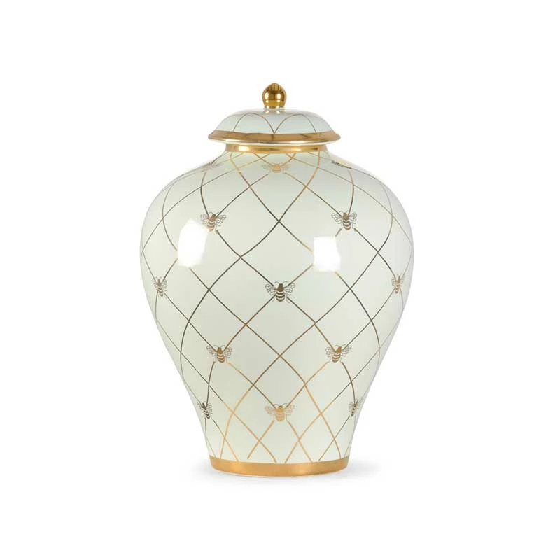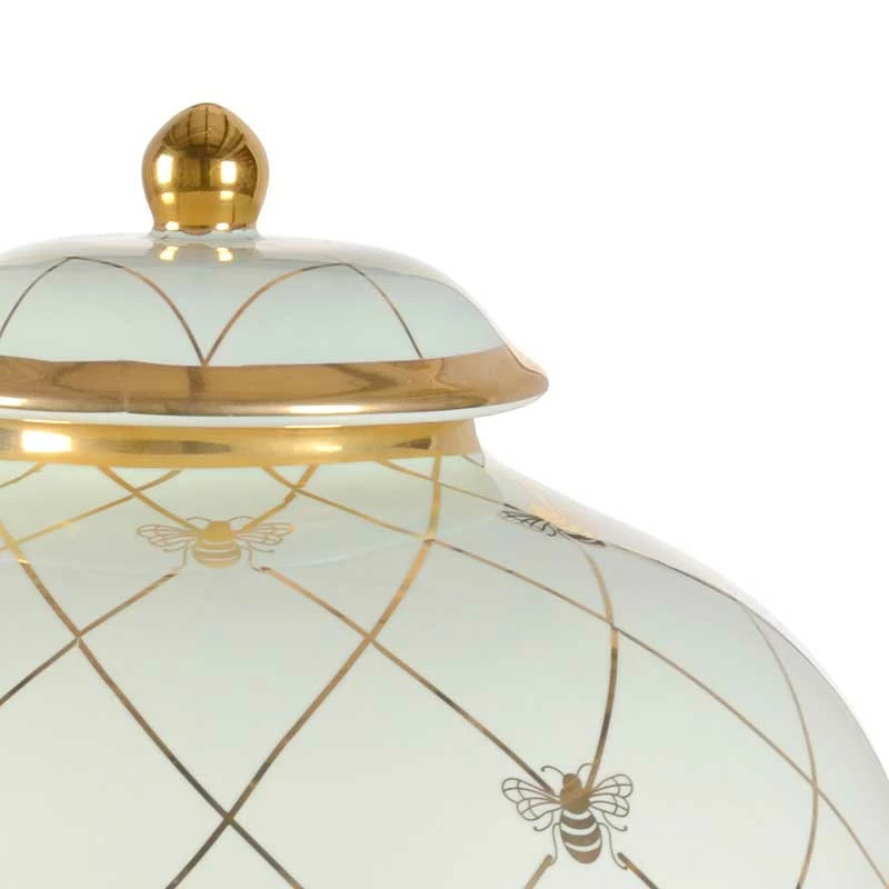 This Bee Humble Ginger Jar in frostworks is the countertop version of a traditional ginger jar. Featuring a royal bee in metallic satin gold, this jar will coordinate nicely with the larger table top version and the smaller jars. Available in a variety of colors from designer Shalyla Copas.
