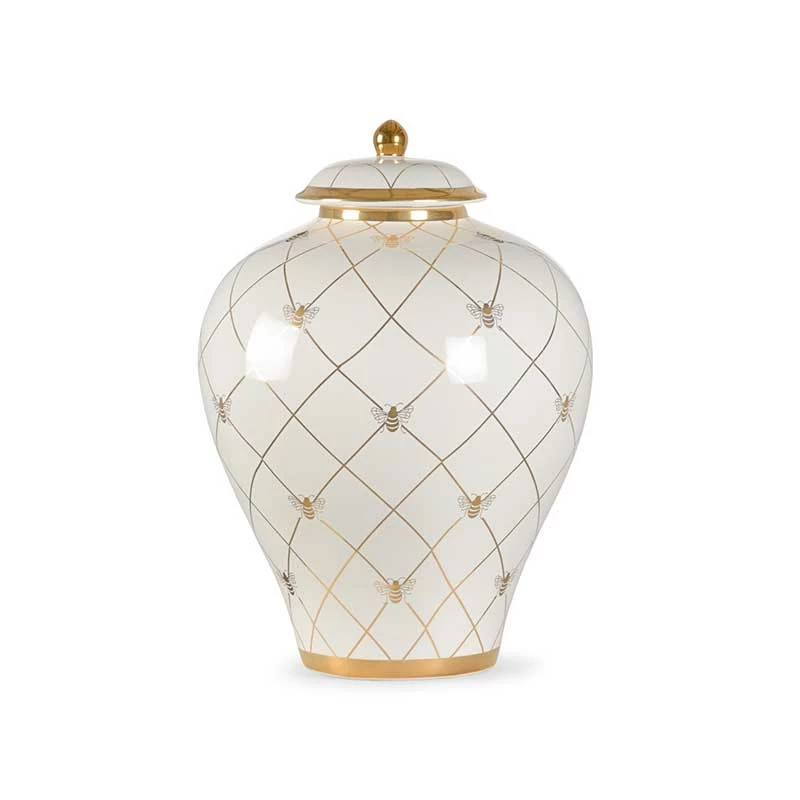 This Bee Humble Ginger Jar in white is the countertop version of a traditional ginger jar. Featuring a royal bee in metallic satin gold, this jar will coordinate nicely with the larger table top version and the smaller jars. Available in a variety of colors from designer Shalyla Copas.