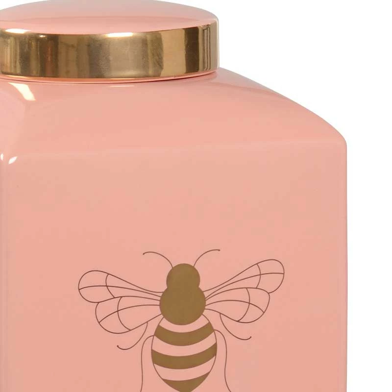 The Bee Gracious Ginger Jar in coral features a royal bee in metallic satin gold. This smaller version of a traditional ginger jar will coordinate nicely with the larger table top version. Available in a variety of colors from designer Shalyla Copas.
