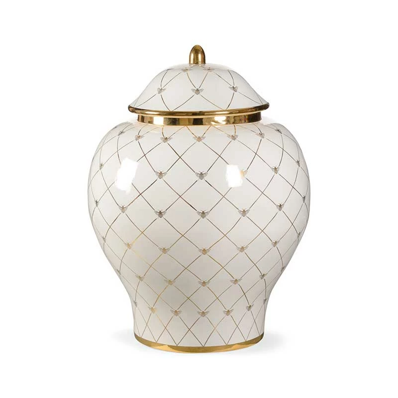 This Bee Humble Ginger Jar in white is a substantial floor size ginger jar. Featuring a royal bee in metallic satin gold, this jar will coordinate nicely with the entire collection of counter and tabletop jars. Available in a variety of colors from designer Shalyla Copas.