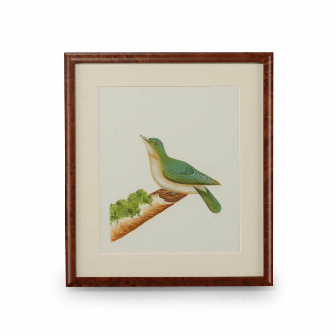 Flights of Fancy XII hand painted watercolor from the Lisa Kahn Collection. Resting upon its perch, this bird is surrounded with a single mat in a walnut burl frame