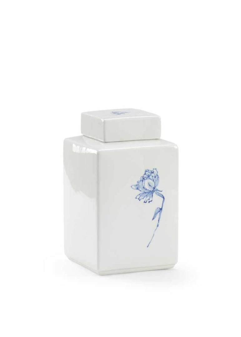 A delicate tulip on the Jizhou Vase adorns one panel and the lid of this ceramic jar. Handpainted in blue glaze on white. One of a trio of Jizhou vases from Claire Bell.
