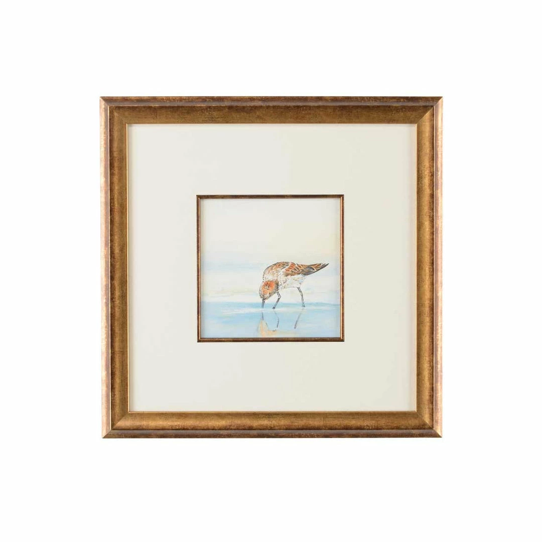 Sand Piper III watercolor from the Lisa Kahn Collection. The solitary Sand Piper casting its reflection is surrounded with a white mat with antique gold fillet in an antique gold frame