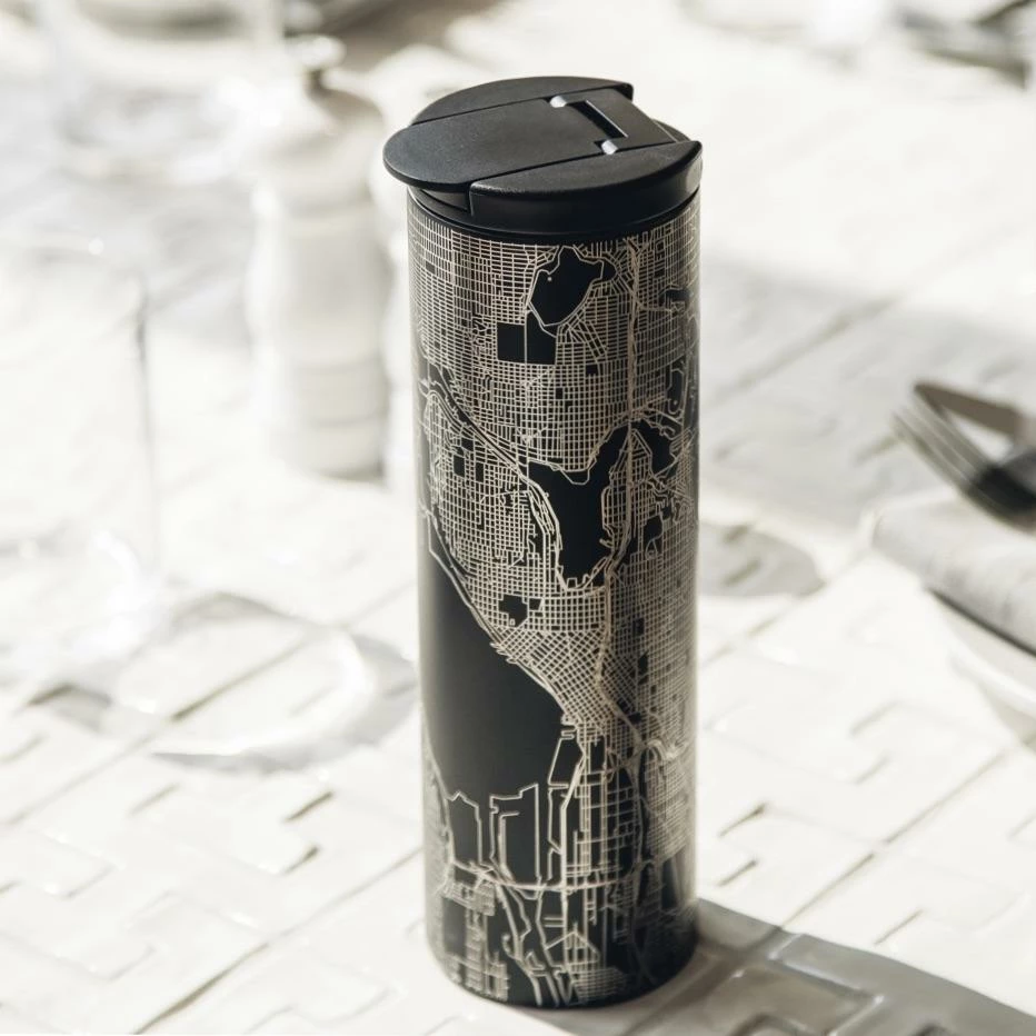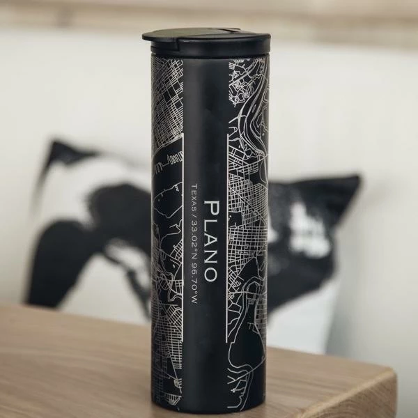 Always have your favorite drink in your favorite tumbler from your favorite location. This matte black insulated tumbler features a laser-engraved map customized with the city or town of your choice, and its name and coordinates. Or add a personal inscription in place of the coordinates.