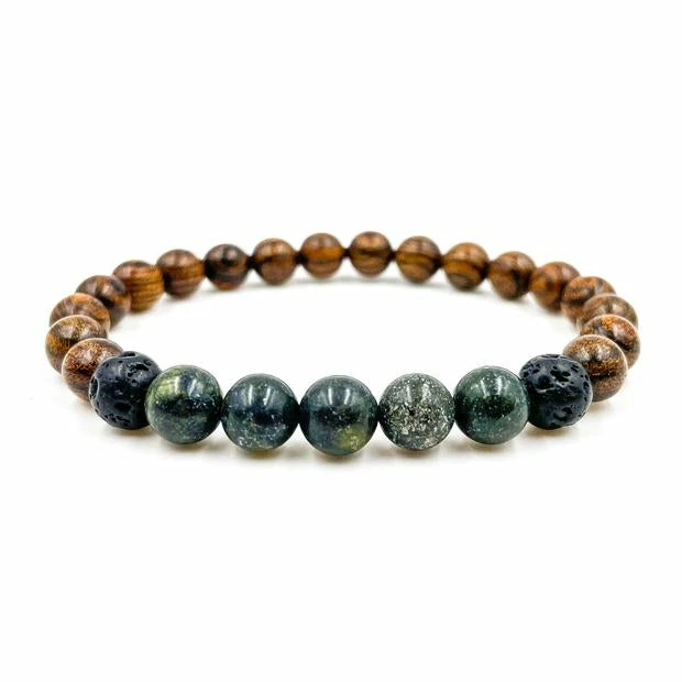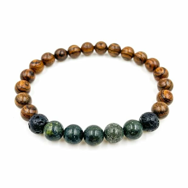 - – 8mm green serpentine, dark sandalwood, and lava rock beads