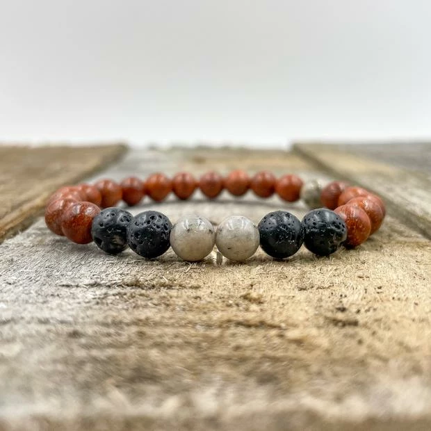 The Grey Feldspar, Lava Rock and Rosewood beaded bracelet combines natural woods with stone for texture and color. Available in two sizes.