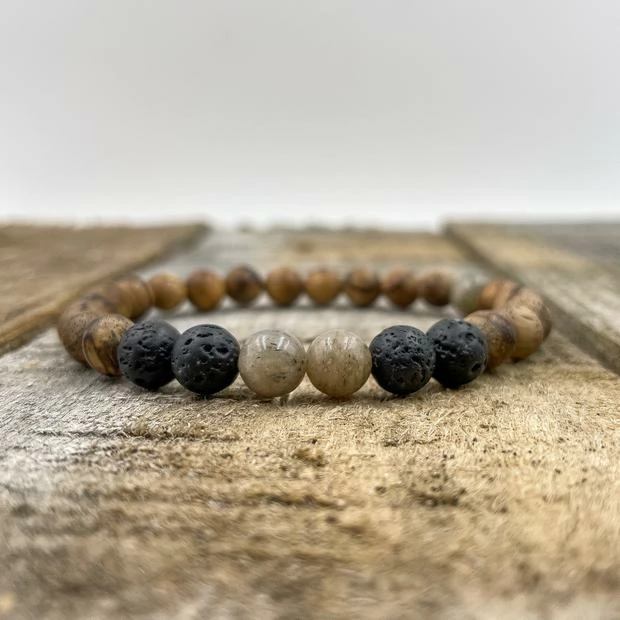 The Grey Feldspar, Lava Rock & Sandalwood beaded bracelet combines natural woods with stone for texture and color. Available in two sizes.