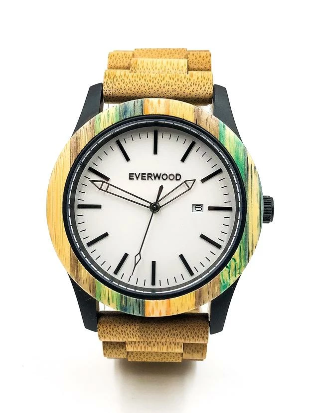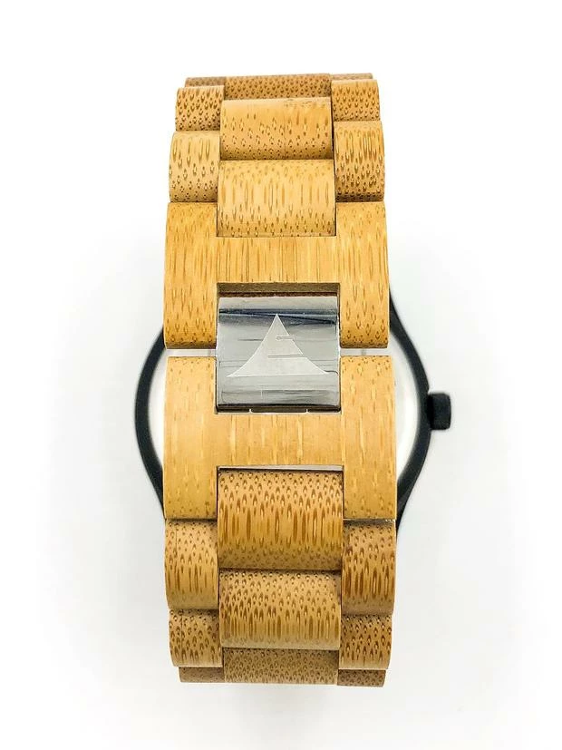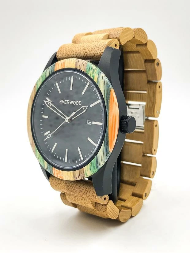 The Limited Edition Watch truly is limited. Only 100 of these multicolored bamboo bezel watches with wood band were produced in each of the white or black dials. The water resistant case houses a Miyota Japanese Quartz movement with 3 hands and date. Complementing the bamboo bezel is a Sandalwood 3 link bracelet with stainless steel clasp. The watch has a manufacturer warranty of 30 days against any wood defect and 2 years of any internal watch defect.