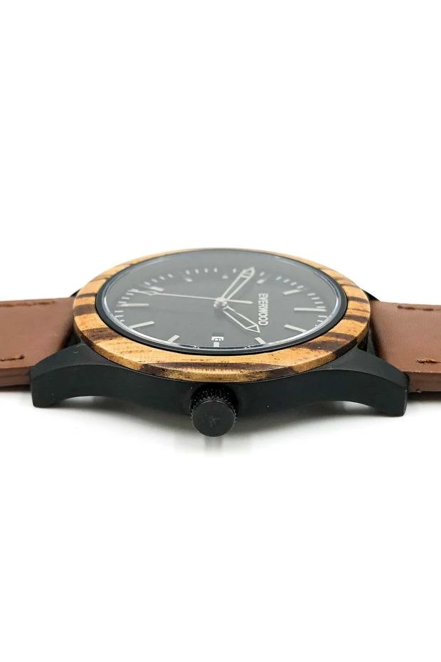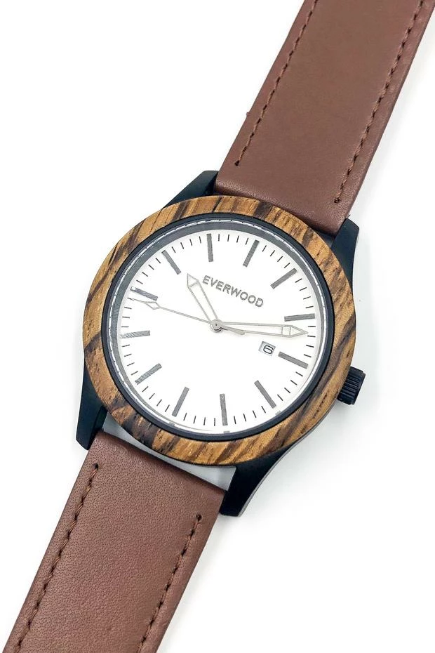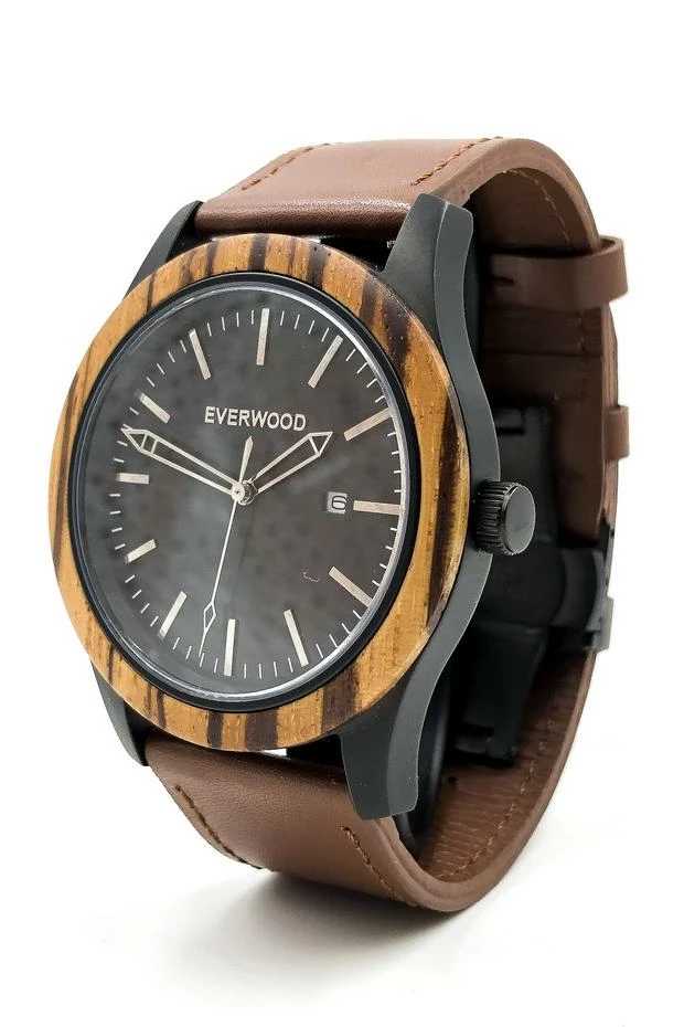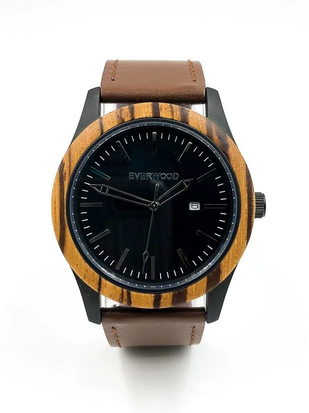 The Zebrawood & Brown Leather watch has exotic appeal in a classic style. The Zebrawood bezel accents a water resistant case with a Miyota Japanese Quartz movement with 3 hands and date. The complementing brown leather adjustable strap features a memory lock stainless steel clasp. The watch has a manufacturer warranty of 30 days against any wood defect and 2 years of any internal watch defect.