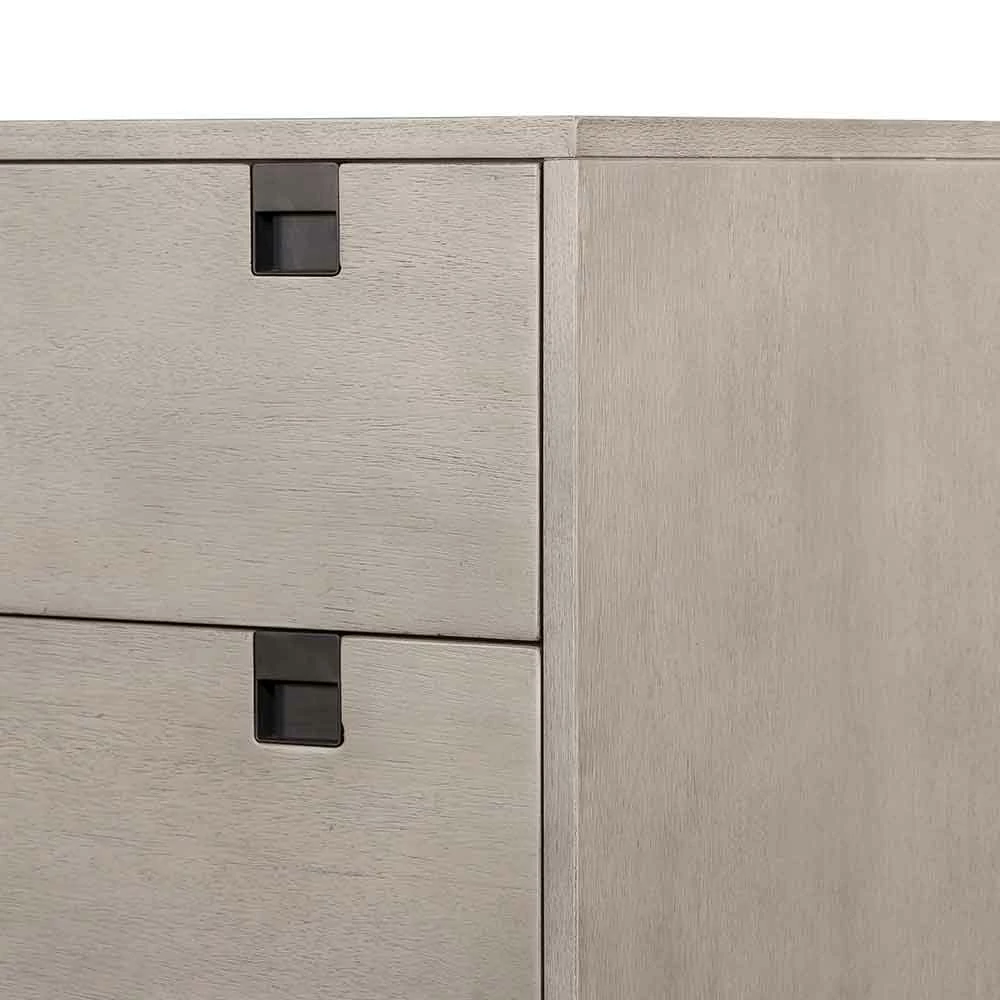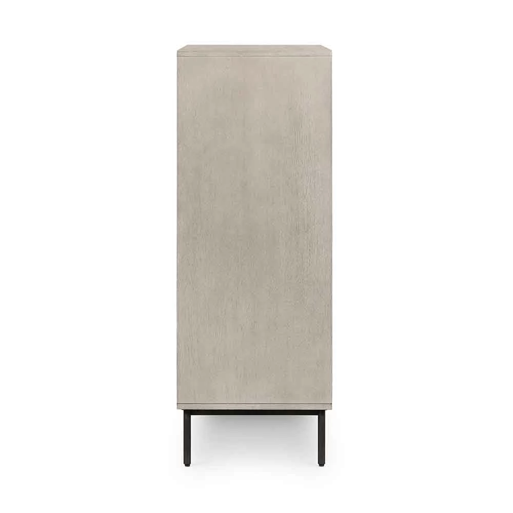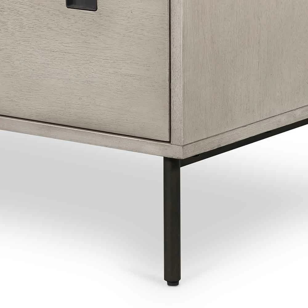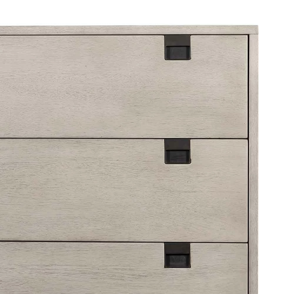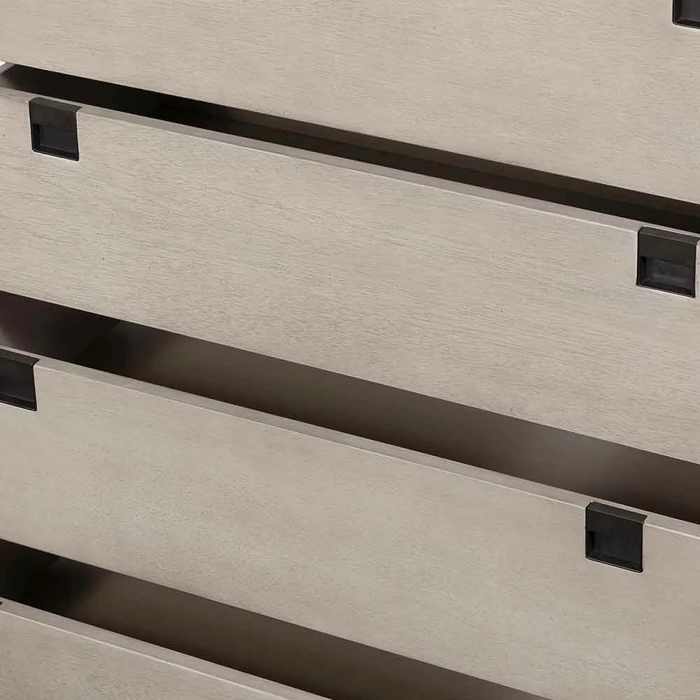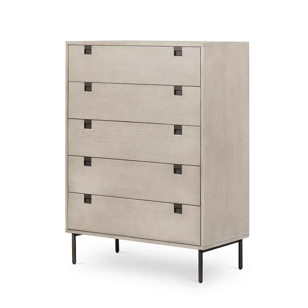 Clean, streamlined shaping brings a structured-yet-light look to bedroom storage with the Carly 5-drawer dresser. Five spacious drawers of grey-washed acacia veneer are perched atop iron legs finished in an antique bronze.