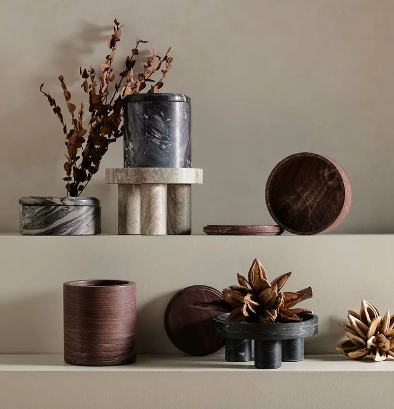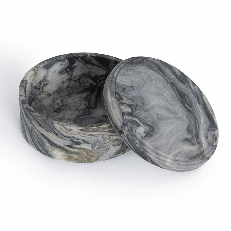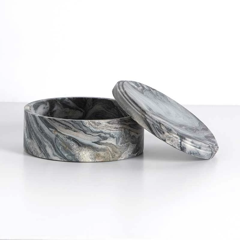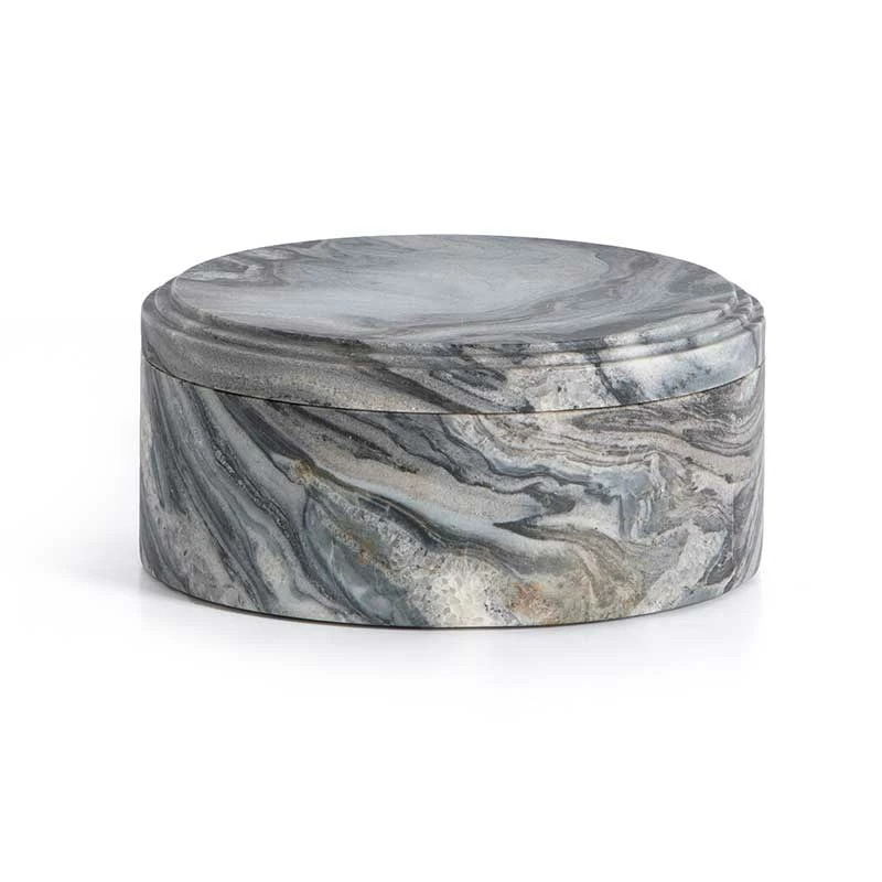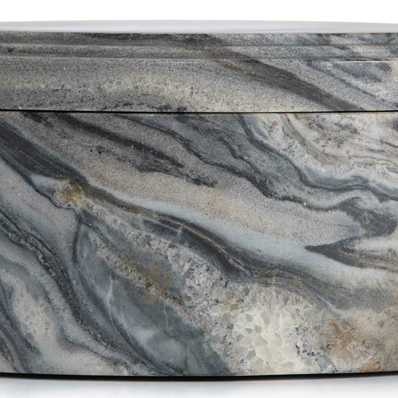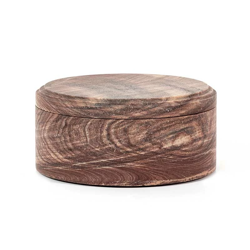 The Emundo Marble Box is a beautiful tabletop accessory and stylish organizer for your jewelry, keepsakes, and more. Available in Tumbled Rust or Black Dune marble, each piece is unique with its fluid veining. Each box has a round lid with stepped edges