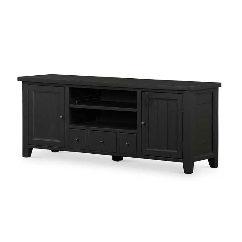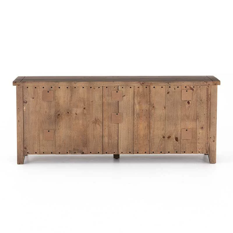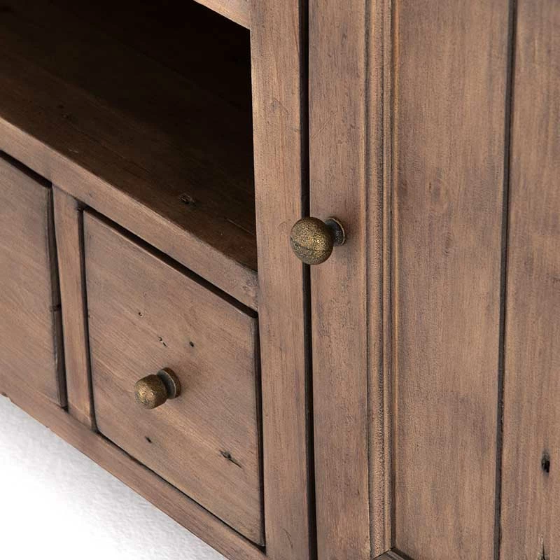 Irish Coast TV Console – naturally distressed, reclaimed pallet wood is transformed into simple, Shaker-style media console. Drawers and doors offer easy storage, with solid brass hardware.