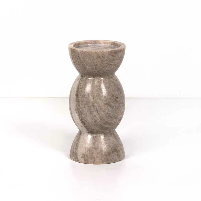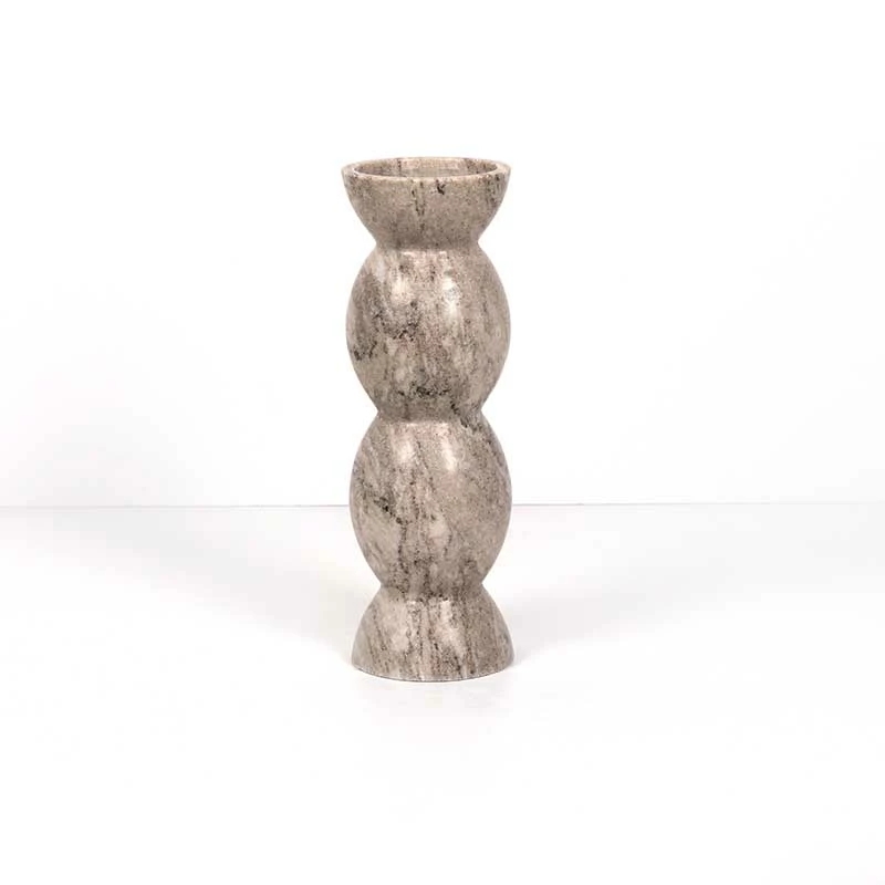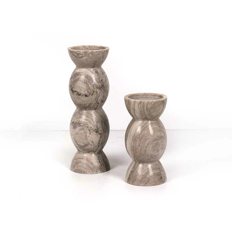 The Kivu Pillar Candle Holder, Set of 2 are soft grey solid marble that has been lathe-turned. These staggered height candlesticks add dimension and subtle color to any decor, on a bookshelf or accenting your dining table centerpiece.