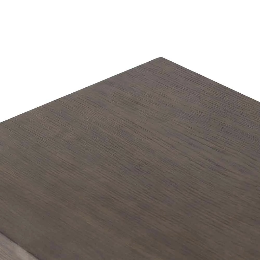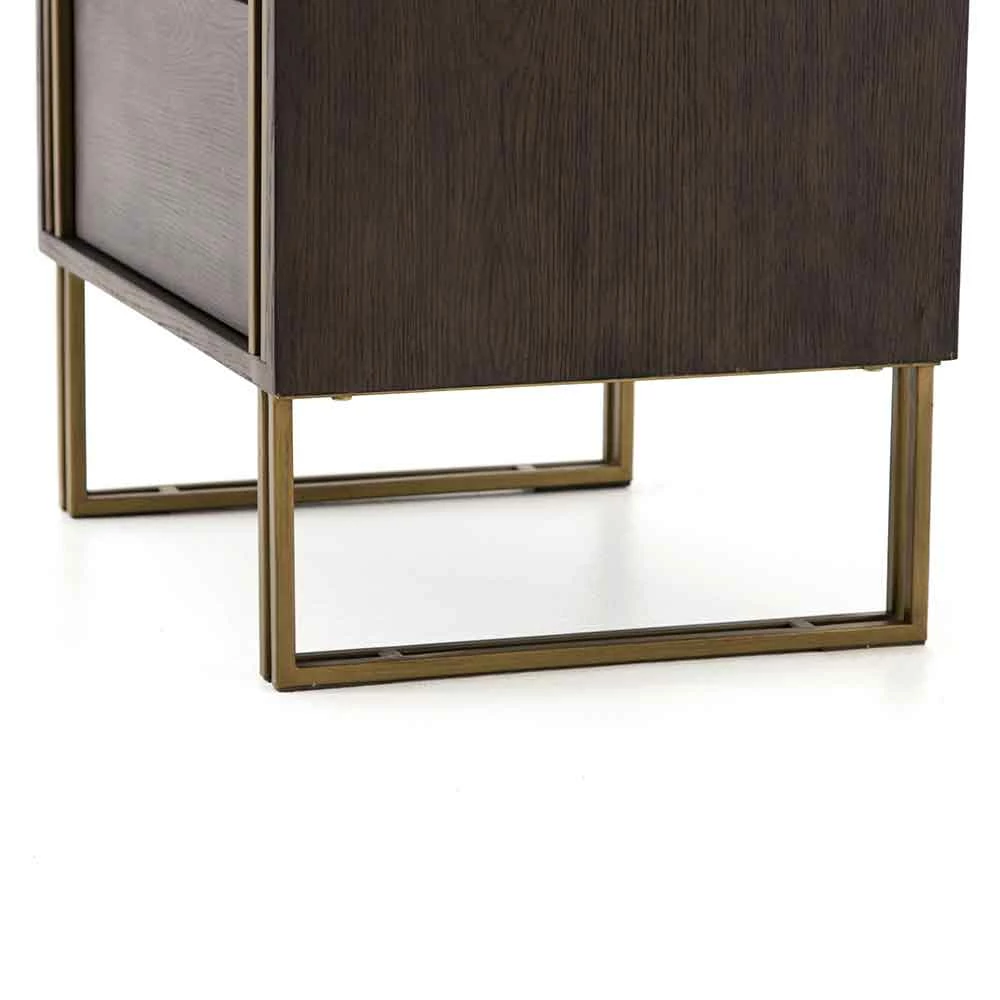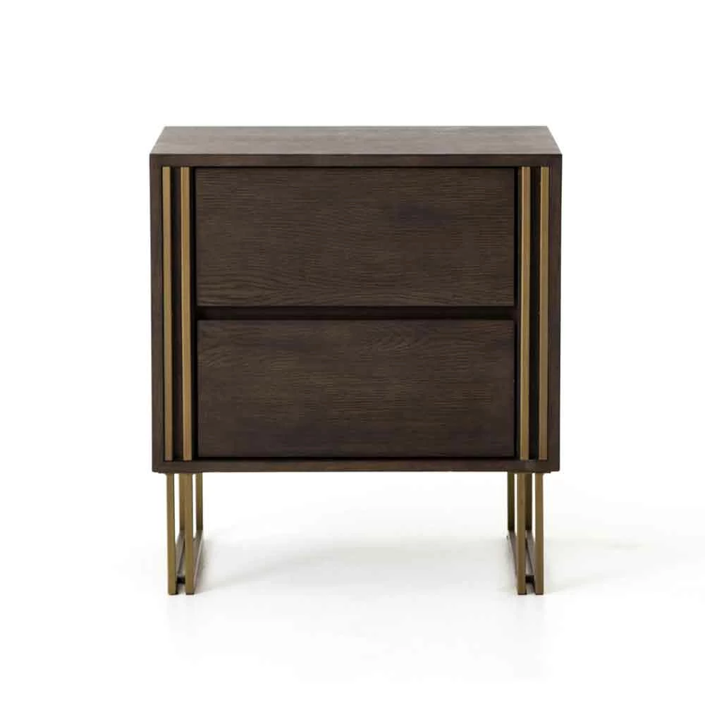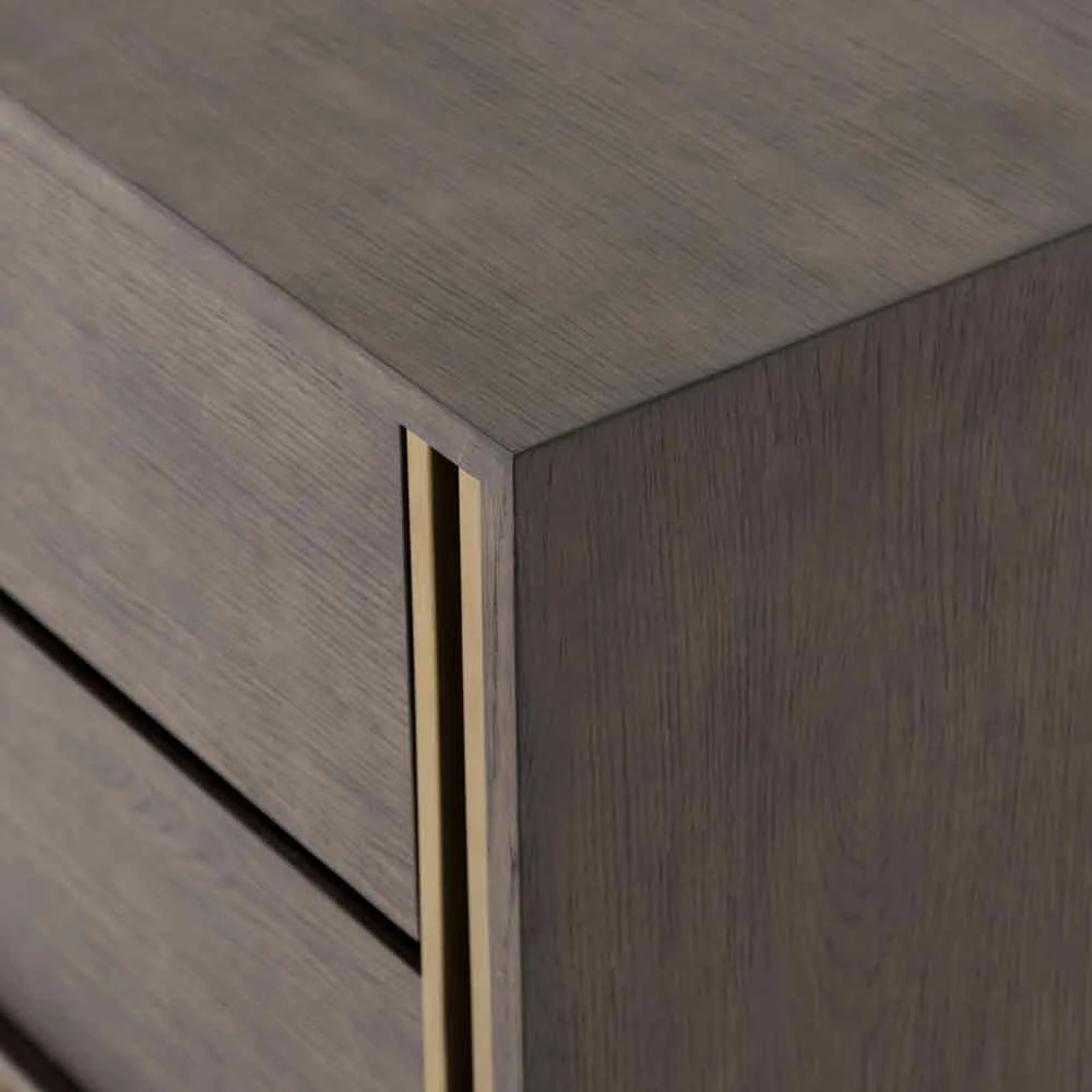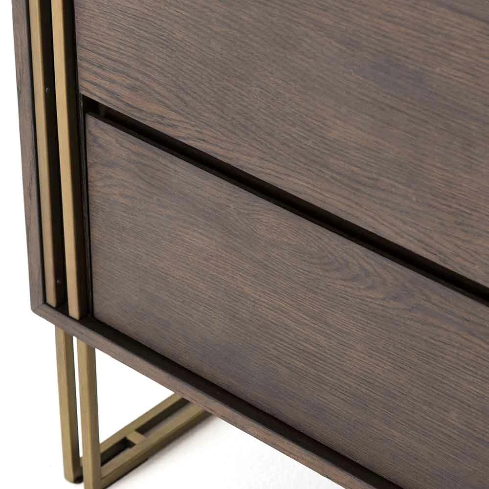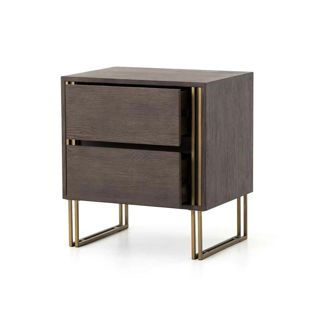 Golden brass banding pairs up for double the intrigue. Rubbed black oak lends warmth to structural shaping. Double-leg trim for depth and a touch of subtle glam. Dual chamfered drawers offer extra bedroom storage.