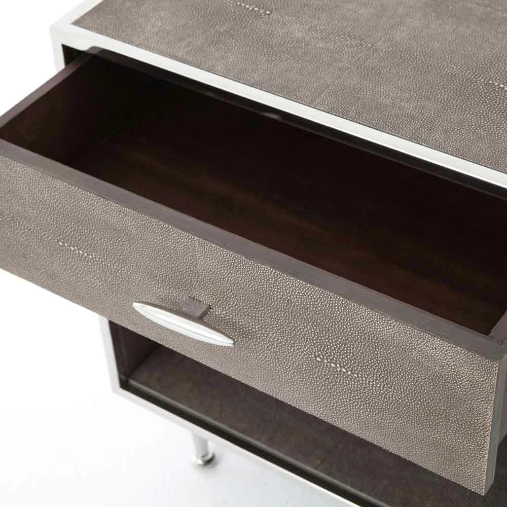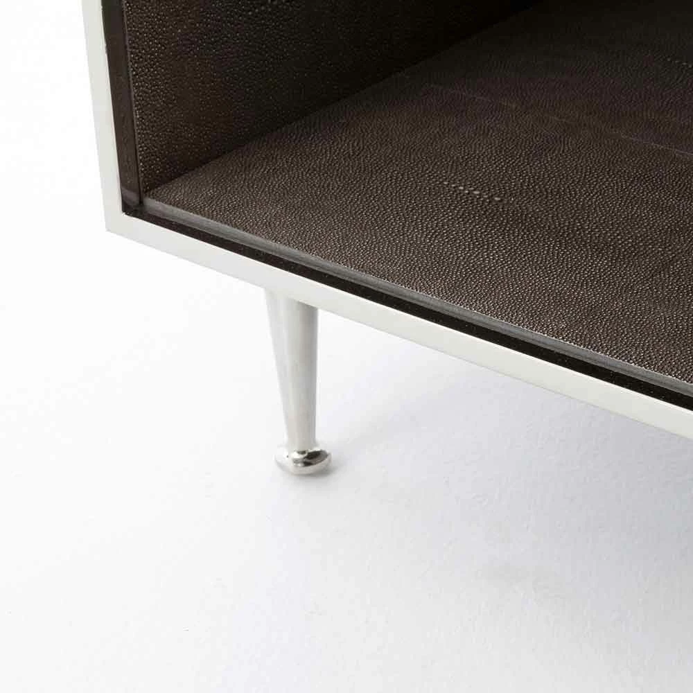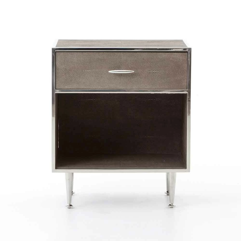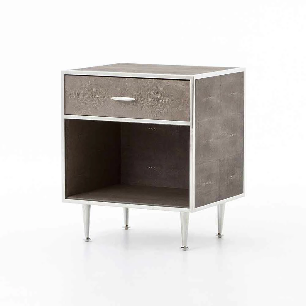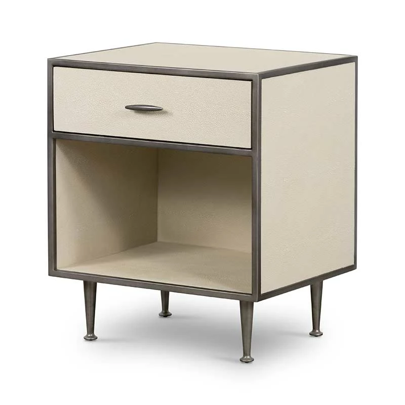Mid-century shaping takes on modern intrigue in the Shagreen Bedside Table. A perfectly cubed bedside table with a drawer for storage available in a variety of covers and finishes: