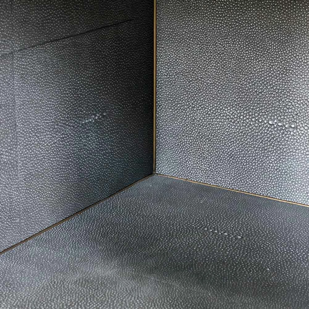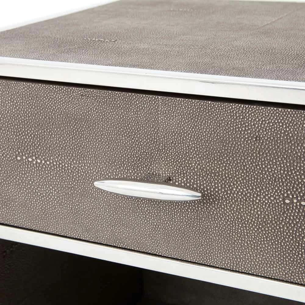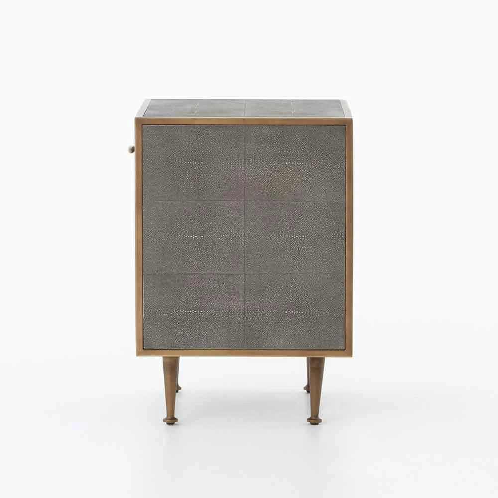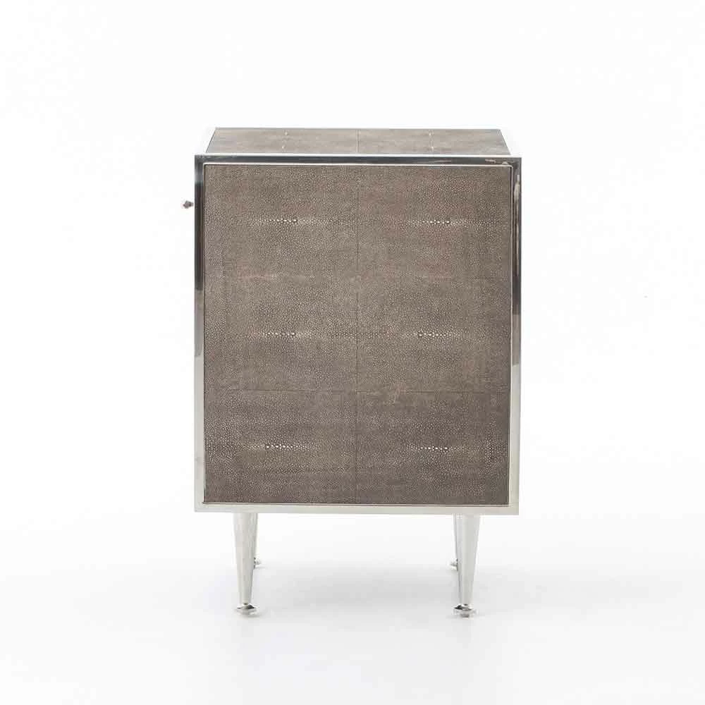 Mid-century shaping takes on modern intrigue in the Shagreen Bedside Table. A perfectly cubed bedside table with a drawer for storage available in a variety of covers and finishes: