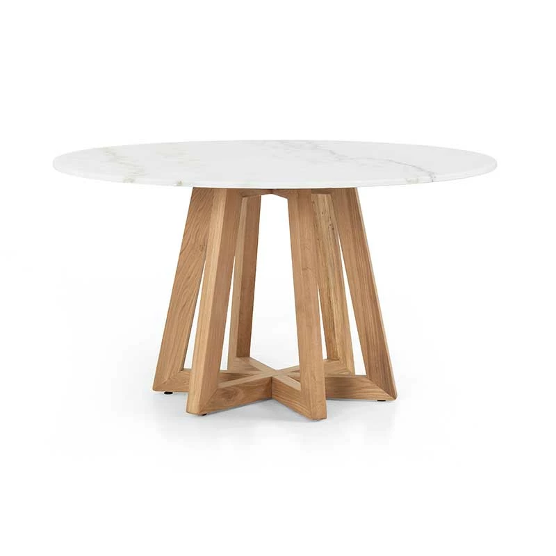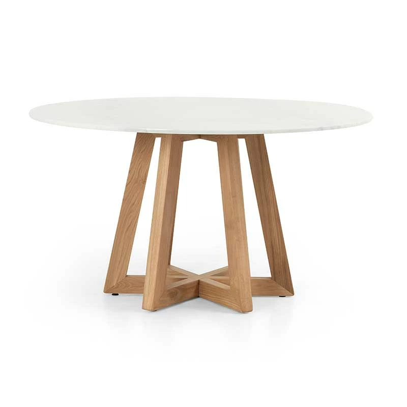 The Creston White Marble dining table is a beautifully fresh take on modern farmhouse. An open, angular base of light honey-finished oak supports a rounded tabletop of white marble, for a clean, versatile look great for everyday dining.