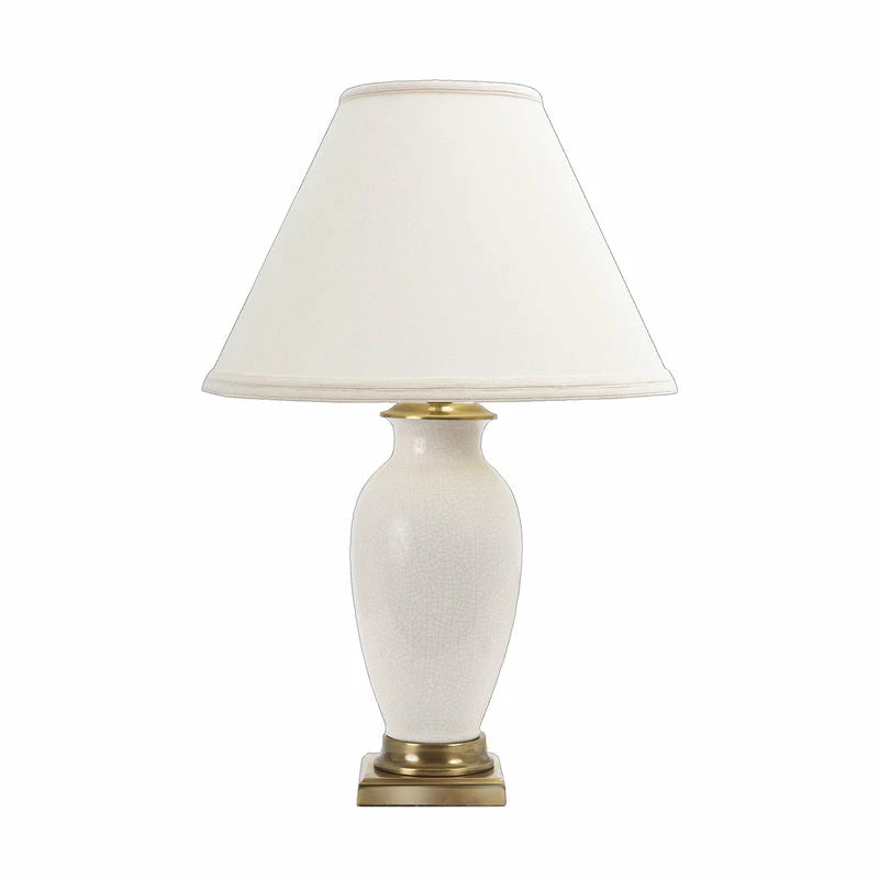 Simply elegant is the Kyoko Lamp in a white rice crackle finish with brass mounting and trim. This lamp will add a subtle touch of Asian charm to your lighting decor.