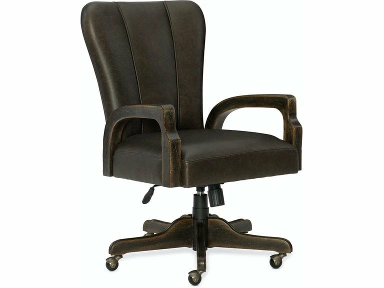 From farm-to-decor looks to rustic luxe, AMERICAN LIFE evokes a sense of community, easy living and authentic craftsmanship embodied in the Crafted Desk Chair. It was during a local road trip and seeing first-hand a new wave of store fronts with rustic charm that the Crafted Collection was born. Constructed of poplar solids and oak veneers in a finish that is reminiscent of a bourbon barrel burnished over time, the collection features authentic design details including aluminum accents with a heavy copper patina, aged leather accents on case pieces, leather-wrapped hardware and heavily distressed textured finishes that provide authentic, aged character.