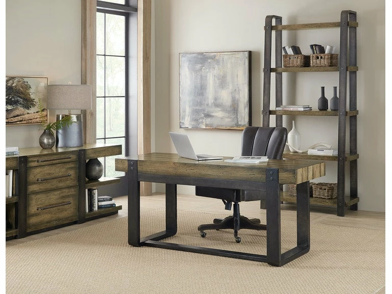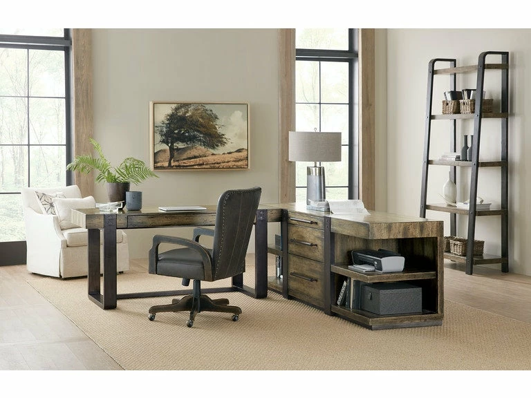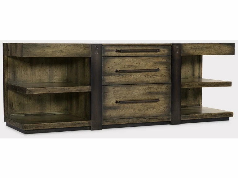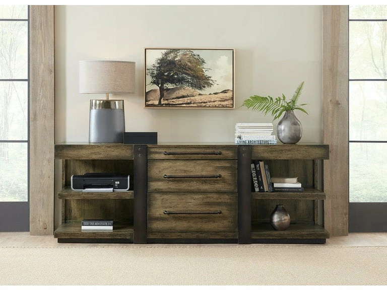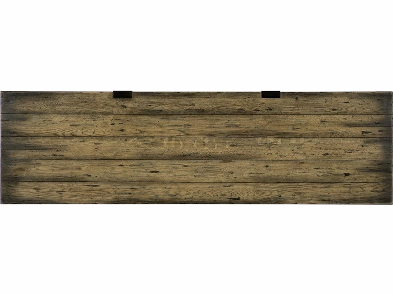 From farm-to-decor looks to rustic luxe, AMERICAN LIFE evokes a sense of community, easy living and authentic craftsmanship embodied in the Crafted Leg Desk Credenza. It was during a local road trip and seeing first-hand a new wave of store fronts with rustic charm that the Crafted Collection was born. Constructed of poplar solids and oak veneers in a finish that is reminiscent of a bourbon barrel burnished over time, the collection features authentic design details including aluminum accents with a heavy copper patina, aged leather accents on case pieces, leather-wrapped hardware and heavily distressed textured finishes that provide authentic, aged character.