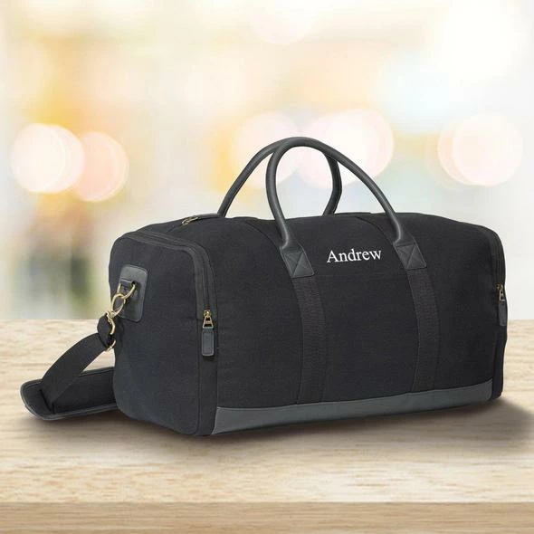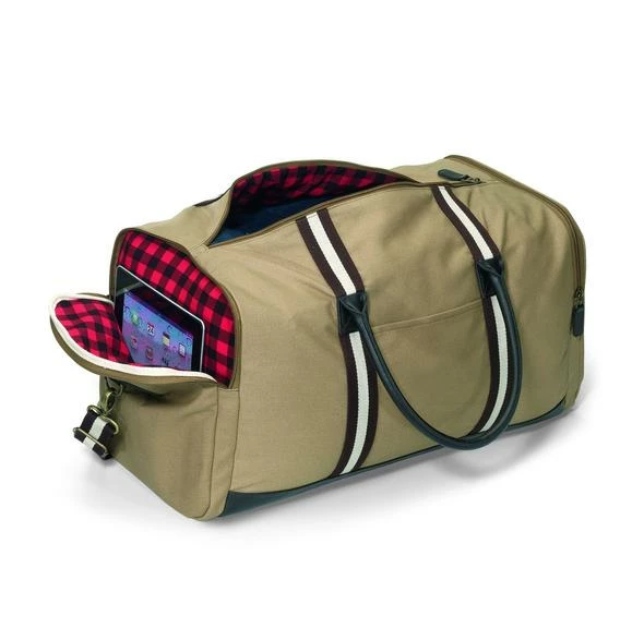 Our Personalized, Heavy Khaki Canvas Duffle Bags are the ultimate in comfort, security and style. With reinforced grab handles, a removable adjustable shoulder strap, Vegan leather bottom and zipper pulls and stylish plaid interior lining, your belongings have never been safer. These duffle bags feature a padded and zippered tablet pocket, antique brass hardware and additional pockets for all of your treasured possessions. Available in Khaki or Black.