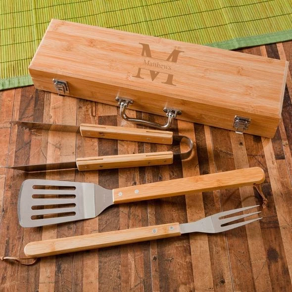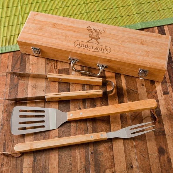 The grill utensil set is lightweight, is great way to store your spatula, fork, and tongs, and keeps your grill tools in top notch condition with protection from the high-quality bamboo case. Each case is equipped with securing latches and a rugged handle.