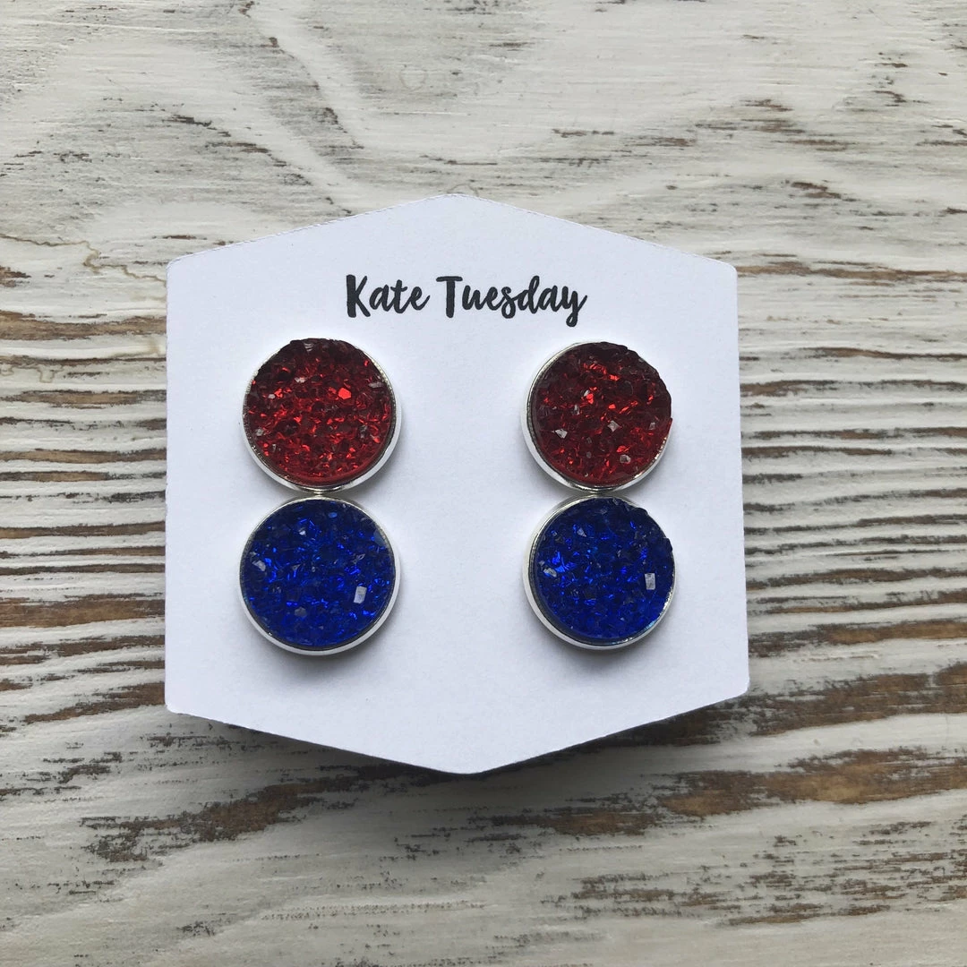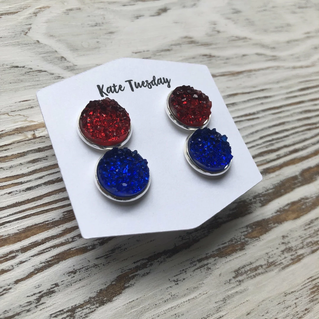 Show off your patriotism with these Red and Blue Druzy July 4th earrings. This double earring set is available in your choice of 4 settings, all nickel and lead free: