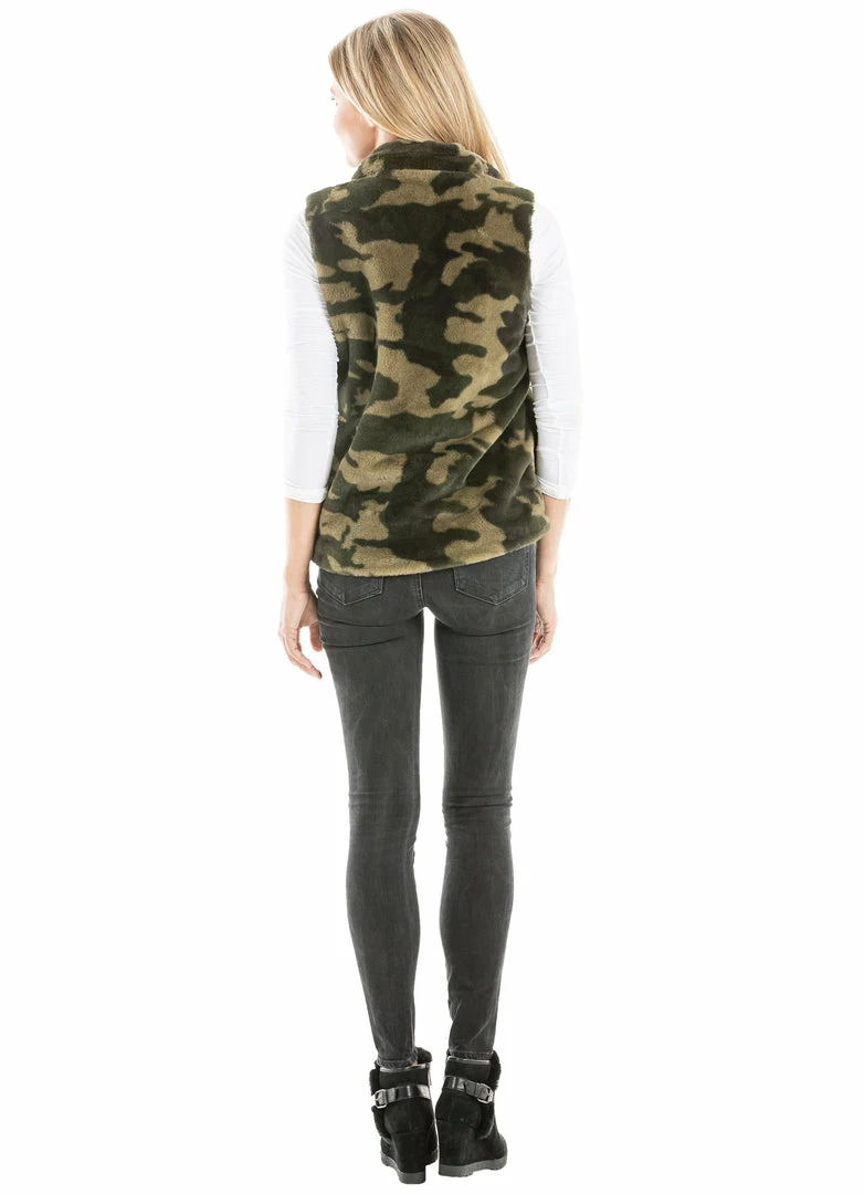 Keep yourself warm with style and value on chilly nights with the Camo Print Faux Fur Vest. Camo is one of the hottest trends this Fall. The faux fur vest is lined, has a full length zipper, and two hidden side pockets to keep your hands warm and keys handy.