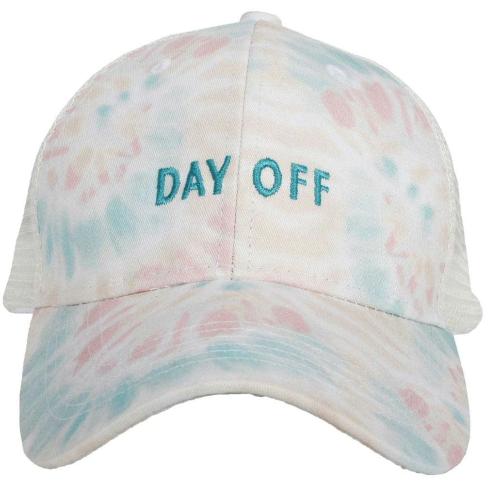 Show everyone you have important leisure time to attend to wearing the Day Off Tie Dye Baseball Cap. Perfect for the urban excursion to the mall or chilling with friends at the beach, the super trendy tie dye cap with embroidered message is 100% cotton. The one-size fits most cap has an adjustable back. Designed by Katydid.