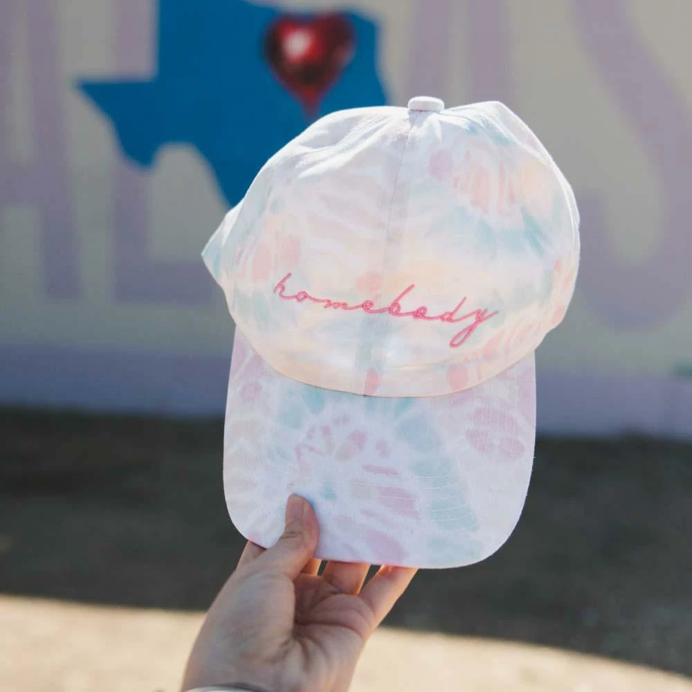 This Homebody Tie Dye Baseball Cap is too cute to keep indoors. Get out and set yourself free with this trendy fashion accessory. Embroidered pink script text adorns the 100% cotton pastel tie dye cap, one size fits most with an adjustable back. Designed by Katydid.