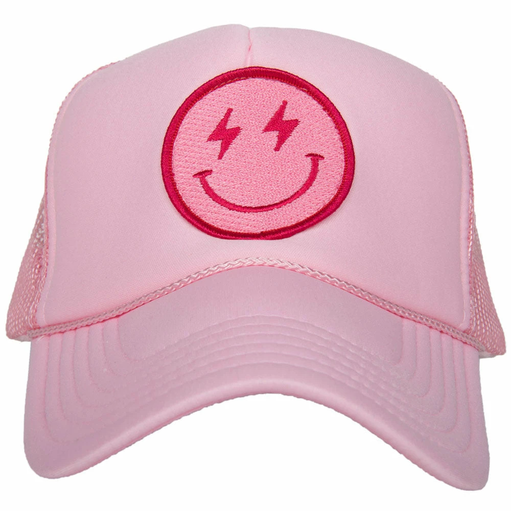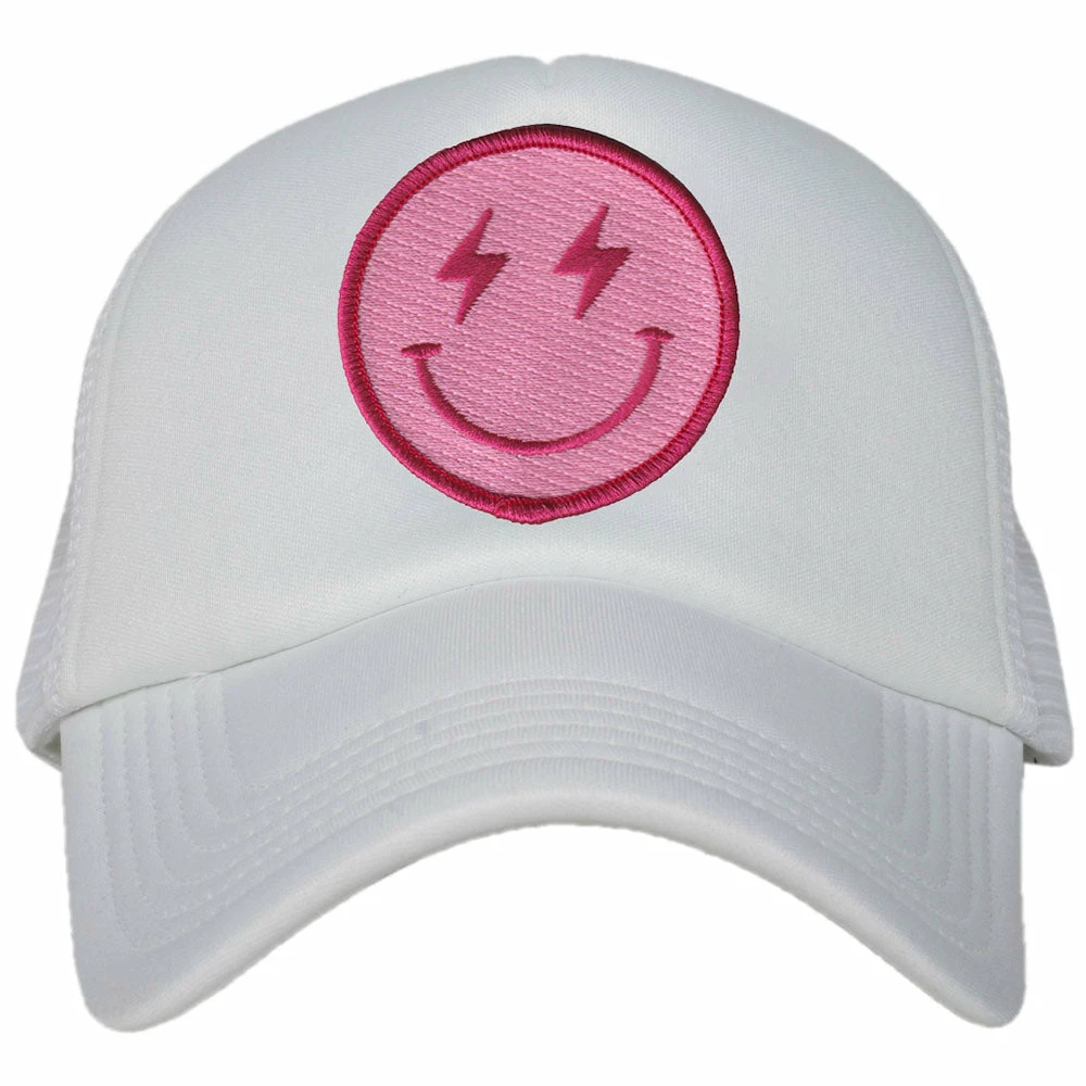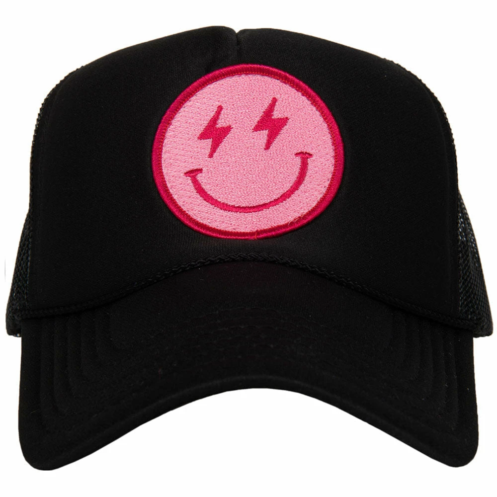 Quickly becoming all the rage is the Hot Pink Lightning Happy Face Foam Trucker Hat for women. The foam front panel hat will have you styling and smiling with the increasingly popular lightning happy face emoji front and center. Available in four different solid colors, this one size fits most cap has a mesh netting back with an adjustable snapback closure. This trucker hat for women is cute and comfortable and perfect for adventures around town or your next “electrifying” vacay.