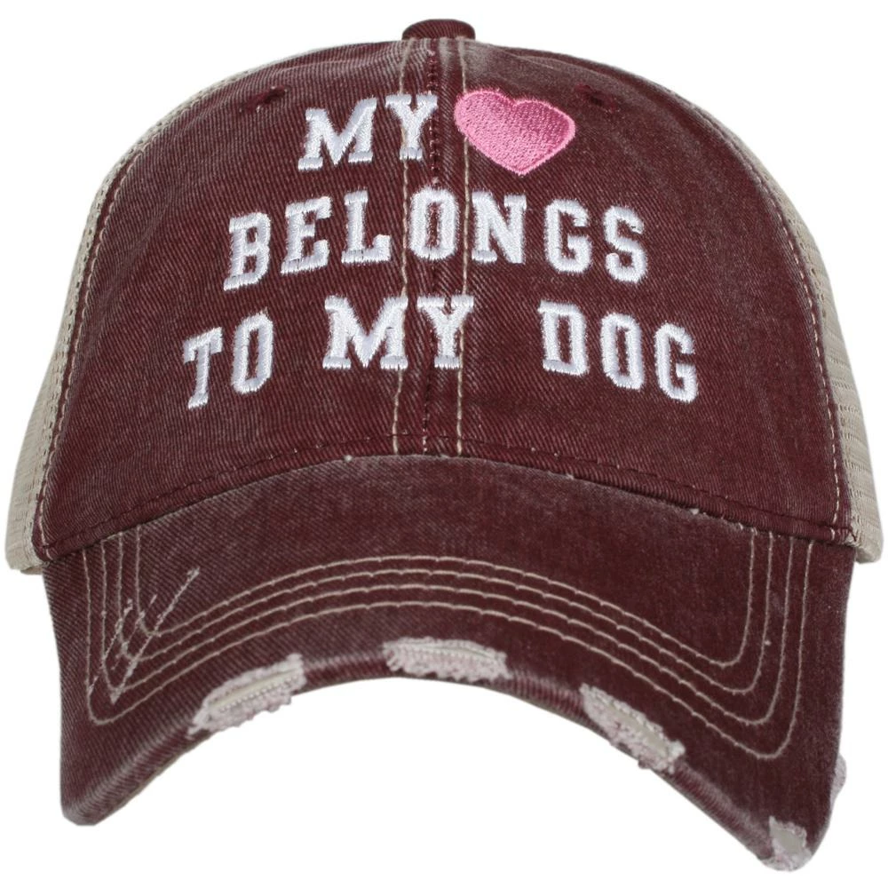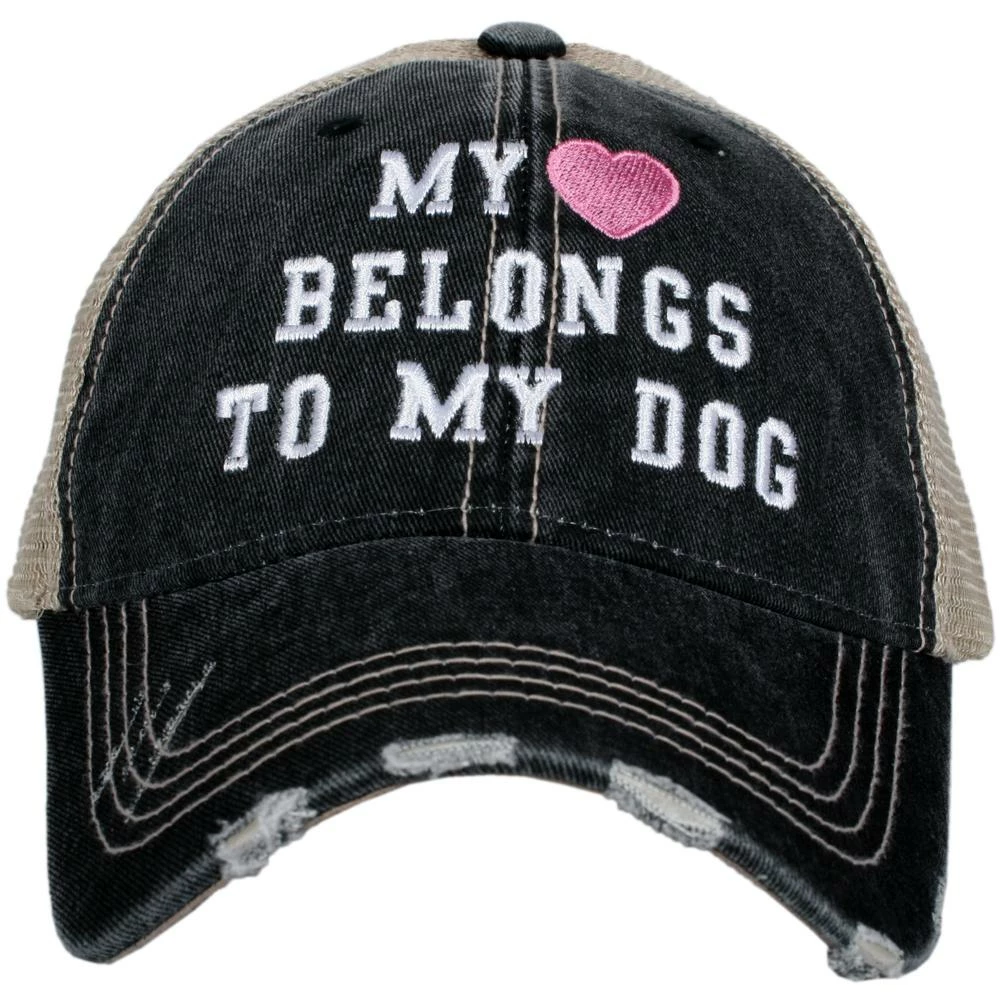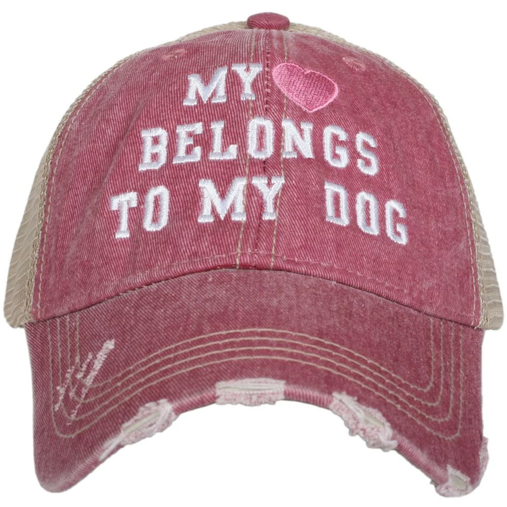 You already know it, now everyone will when you’re walking woman’s best friend and wearing the My Heart Belongs To My Dog Trucker Hat. Embroidered white text and pink heart. Available hat colors: