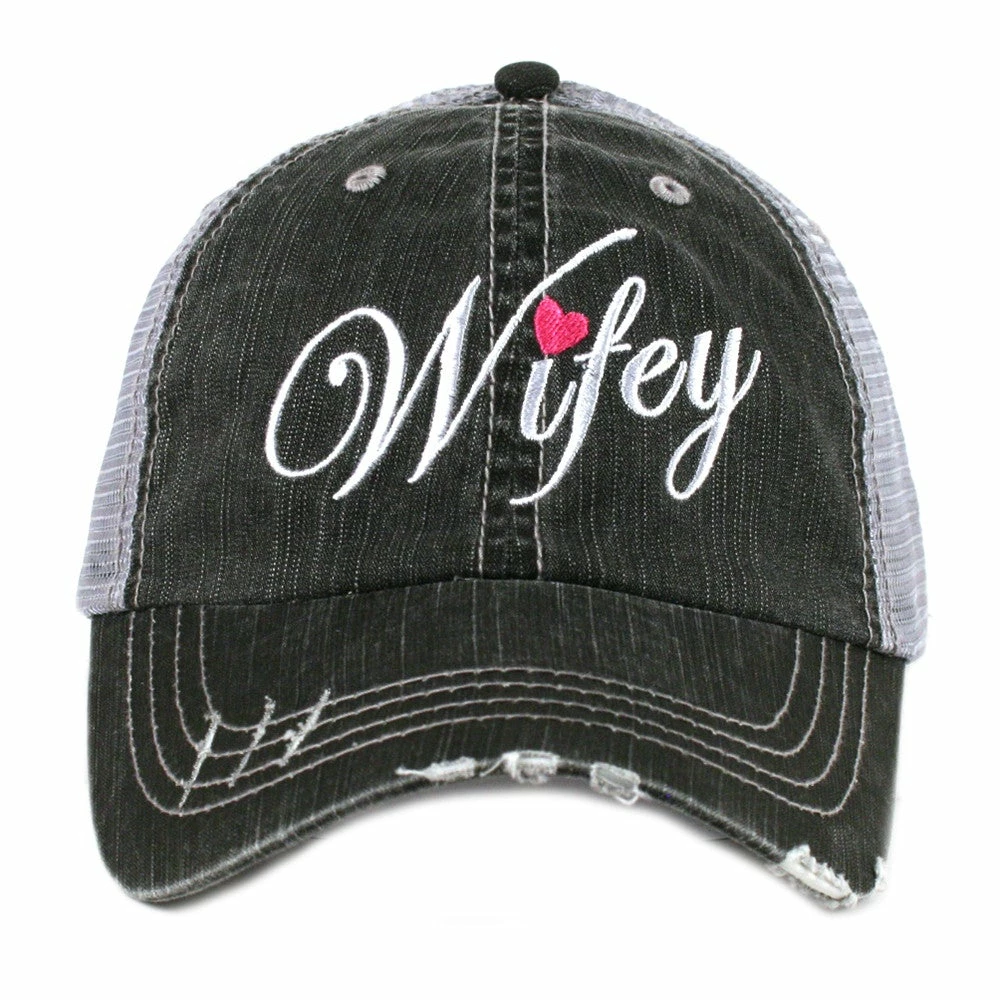 Let everyone know you are gentle and cute on the outside, and sassy on the inside, when when you’re wearing the Wifey Trucker Hat. This trendy cap has the message embroidered in bold white text, accented with a pink heart on the black front panel. The one size fits most grey cap has a curved bill and adjustable tab for a comfortable fit. It has mesh sides and back and is distressed to give it a worn look. Designed by Katydid.