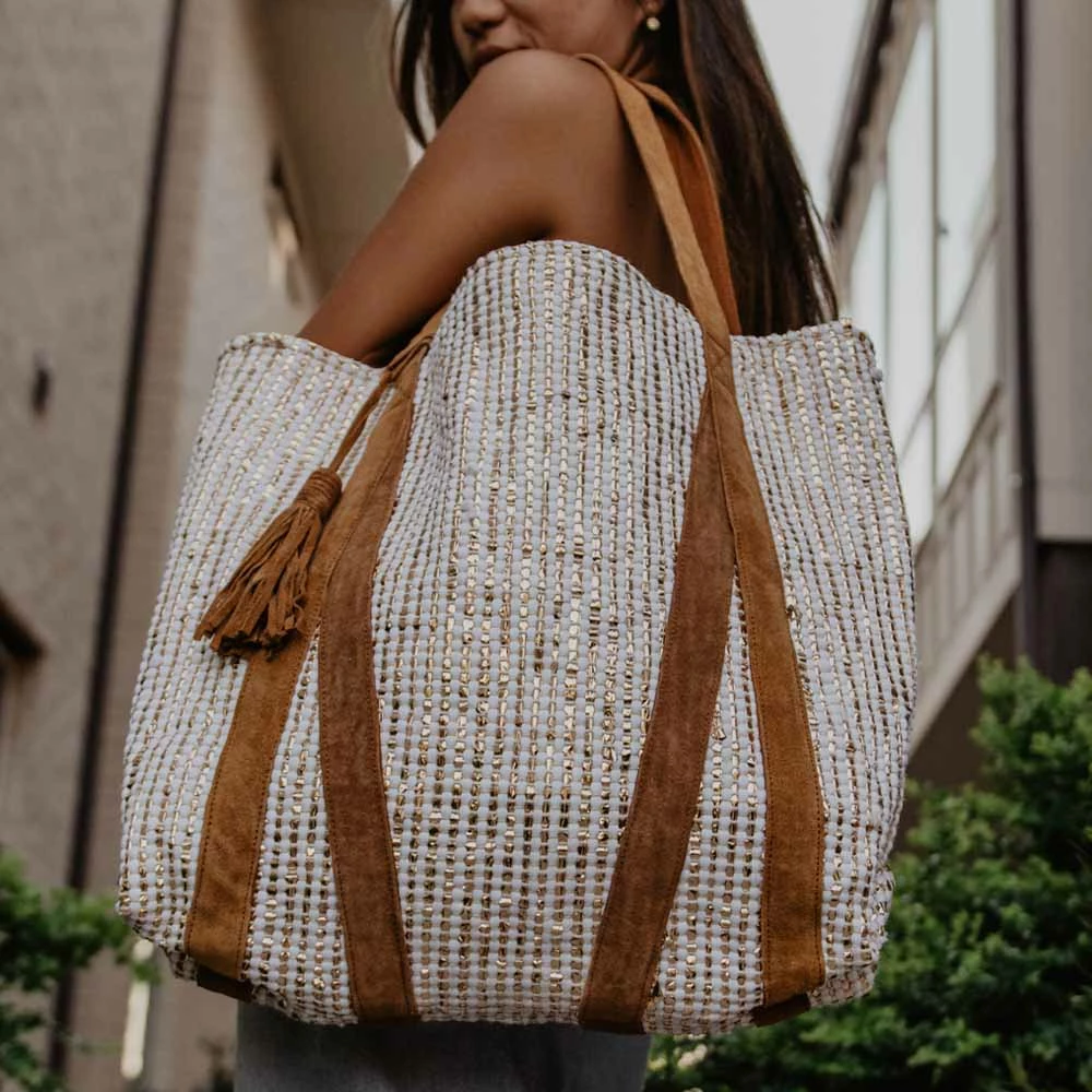- Cream & Metallic Gold Foil Tote Bag With Leather Straps features: