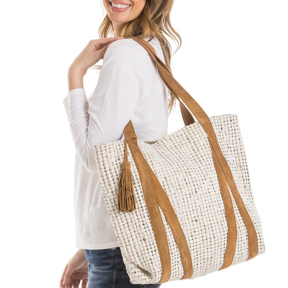 The Cream & Metallic Gold Foil Tote Bag With Leather Straps is a very stylish fashion accessory with bling woven right into the fabric. The over-the-shoulder leather straps even has a leather tassel for added panache. A great tote for the weekend getaway with your sweetie or fashion shopping at the mall. The large tote bag has an interior pocket to keep the important things handy and a snap closure. Designed by Katydid.