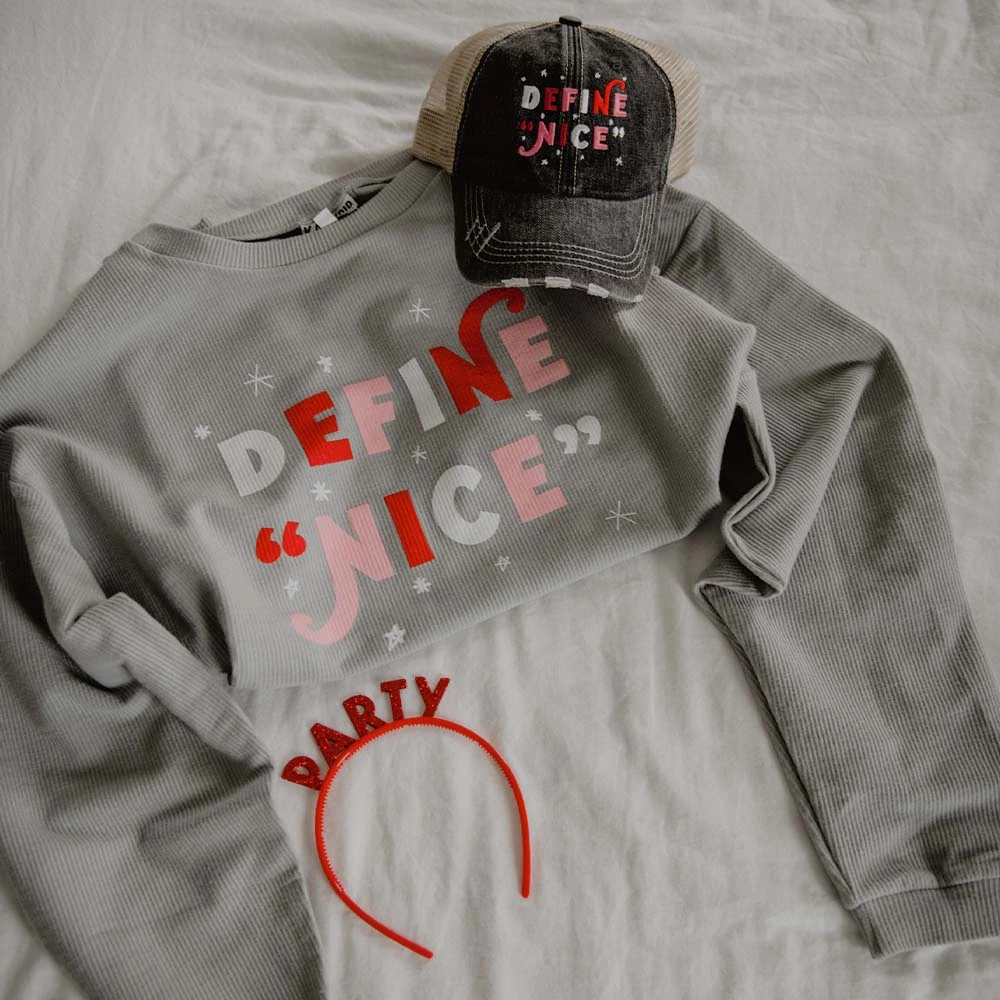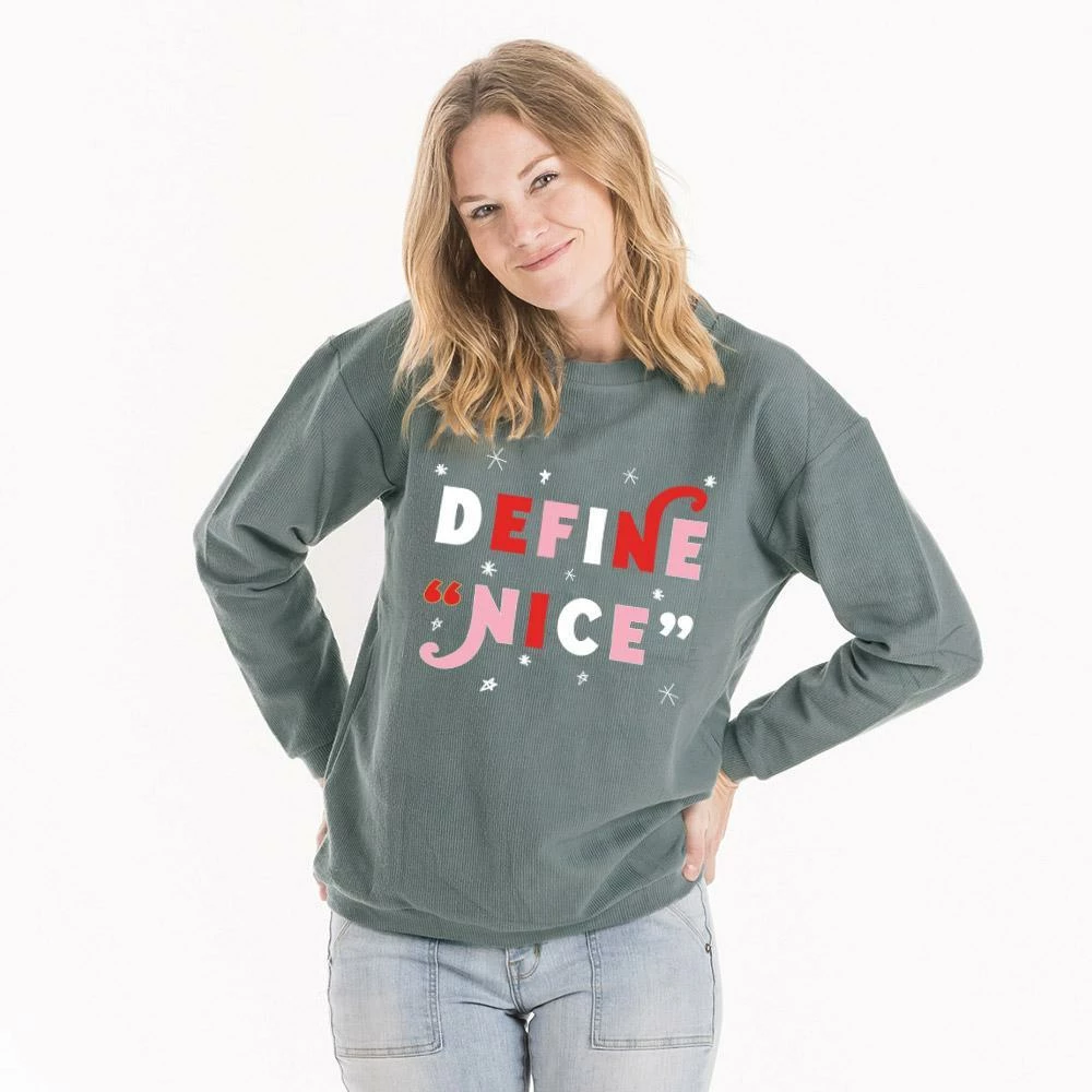 Now, THAT’s the sassy Christmas Spirit! The Define “Nice” Corded Christmas Sweatshirt is cozy and comfy, perfect for your gift shopping excursions or curling up next to your Sweetie in front of the fireplace. The corded fabric is 95% cotton and 5% polyester with a generous fit. Available in Green or Light Grey in sizes S-XL.