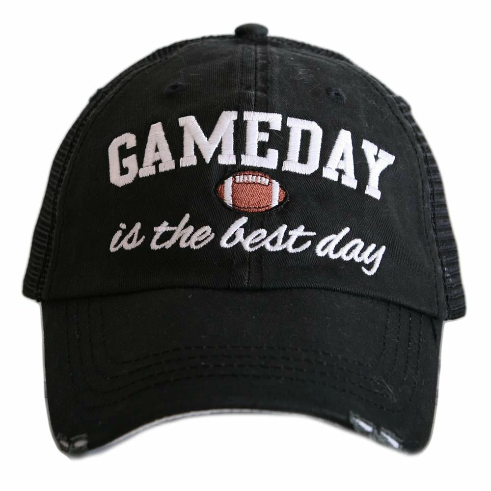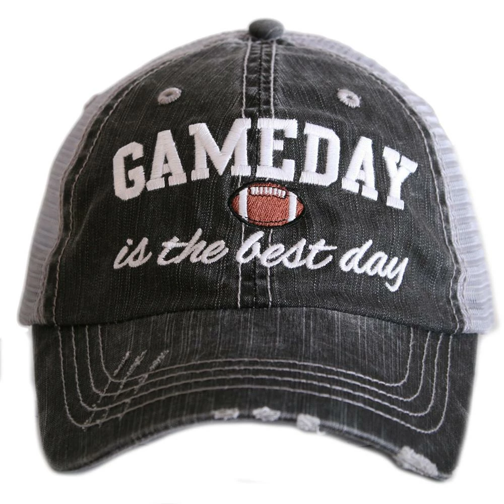 What’s the best day of the week for football? Gameday! Make sure everyone knows what day it is when you wear the Football Gameday Women’s Trucker Hat. Embroidered bold white text with football icon. The one size fits most cap has a curved bill and adjustable tab with mesh back and is distressed to give it a worn look. Available in grey or black. Designed by Katydid.