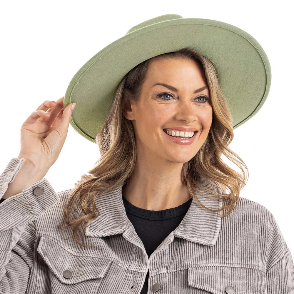This Mint Green Wide Brim Felt Hat for Women will quickly become your fashion go-to for a fun and stylish look. The chic fedora style hat goes great with formal wear or paired with jeans and a tee for a more casual look. Find just the right fit for you with the adjustable sizing ribbon inside the formed crown. Stylish and durable, this hat is 90% polyester, 5% cotton, and 5% wool.