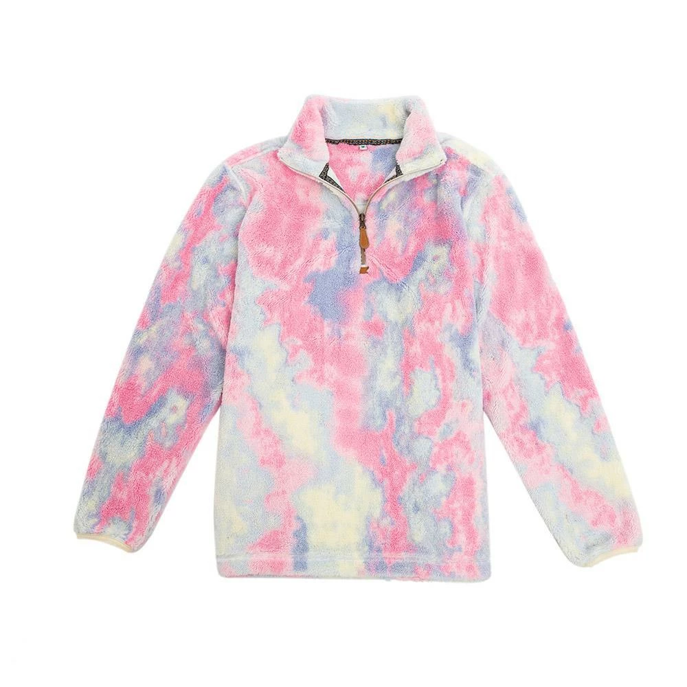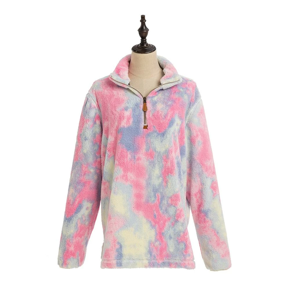 Perfect for you or your BFF is this Tie Dye Women’s Sherpa Pullover. The fluffy faux fur/ polyester fabric is colorful and trendy in the pink and purple tie-dye pattern. The long-sleeve pullover has hidden pockets (perfect for keys or lip balm) and a 3/4 zip front with faux leather pull. Available in sizes S-XXL.