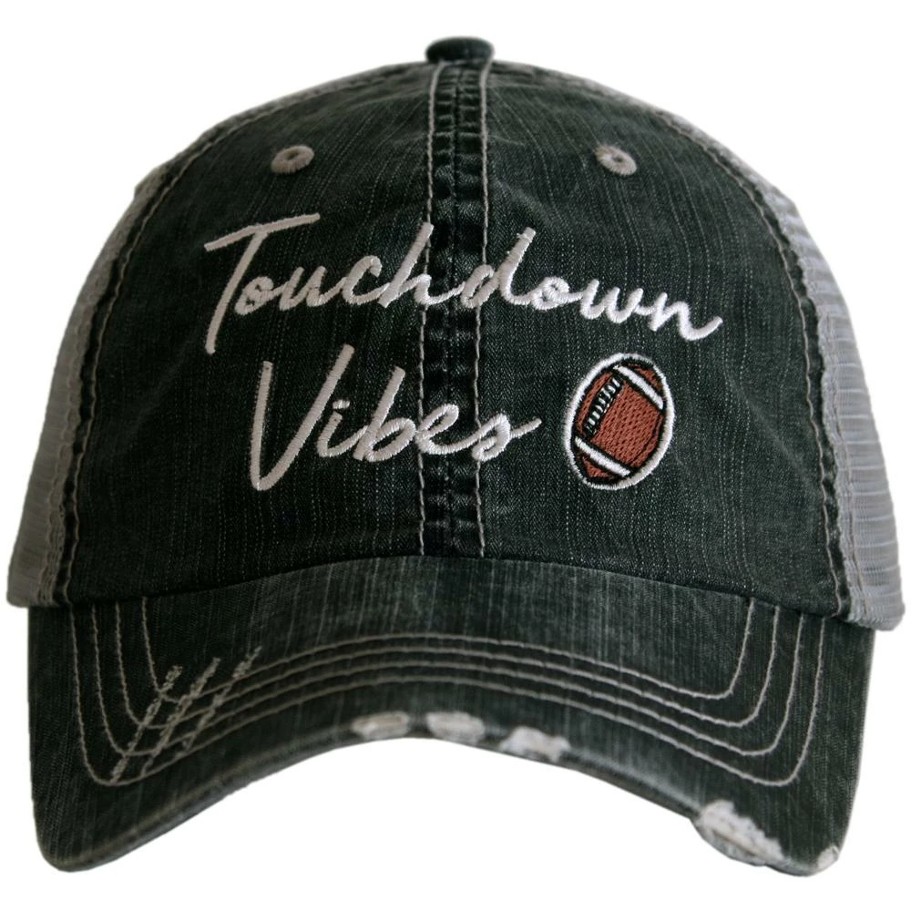The lights are on, teams are on the field, and there is an intensity in the air. Put on the Touchdown Vibes Women’s Trucker Hat and let everyone know it’s game time! Embroidered bold white text with football icon. The one size fits most grey cap has a curved bill and adjustable tab with mesh back and is distressed to give it a worn look. Designed by Katydid.