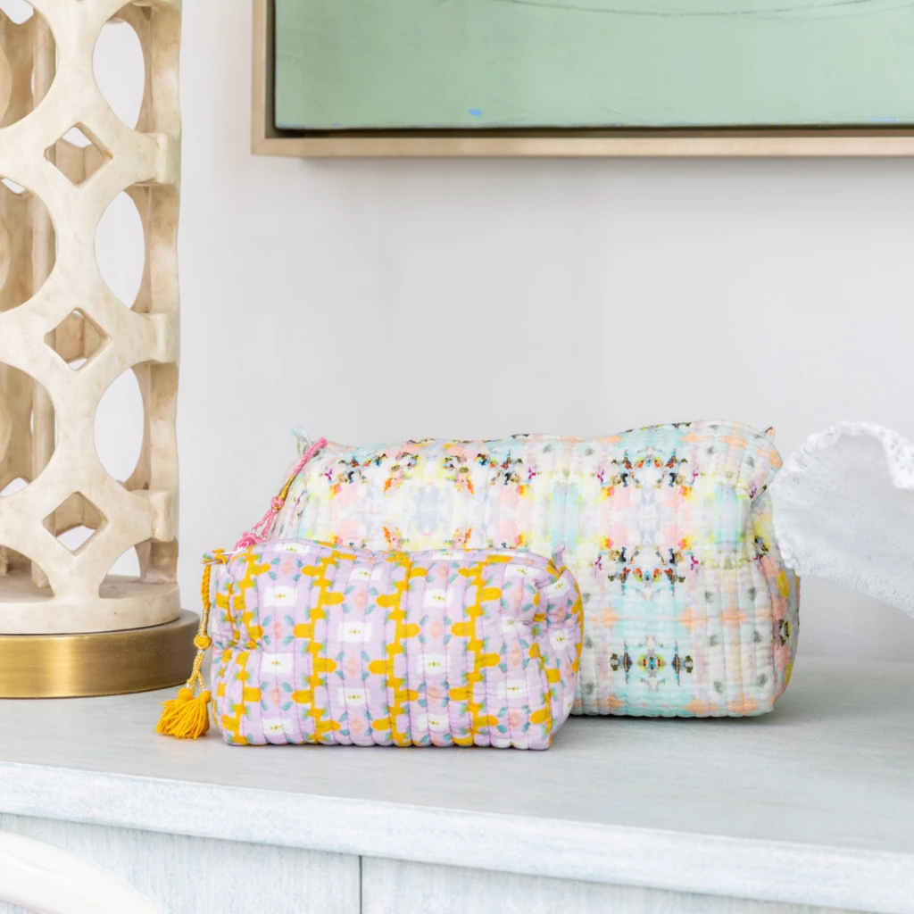Your newest travel companion is the Chloe Lavender Quilted Cosmetic Bag! The colorful 100% cotton cosmetic bag is both stylish and practical with a plastic lined interior for easy wipeable cleanup. Each colorful bag comes with a colored tassel on the zipper for added flare.