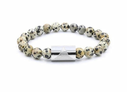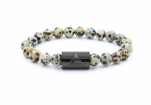 The Dalmatian Jasper Rocky Stone Beaded Bracelet. Opaque and spotty with a tawny, cream-colored base, Dalmatian jasper has a distinct pattern of sporadic black spots similar to the famous fire station dogs. Found in Mexico. Crafted with natural Dalmatian Jasper stone beads and available in multiple sizes.