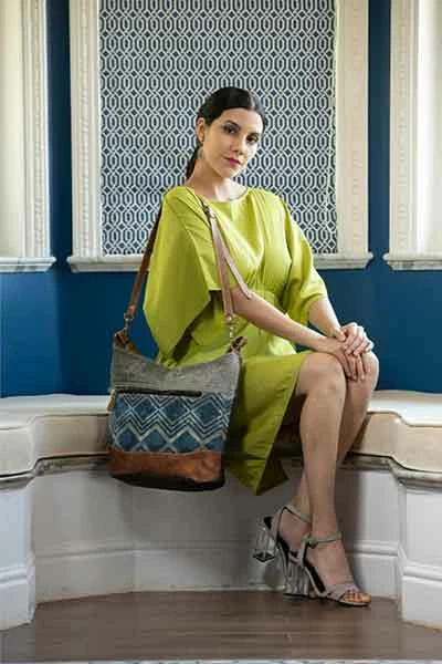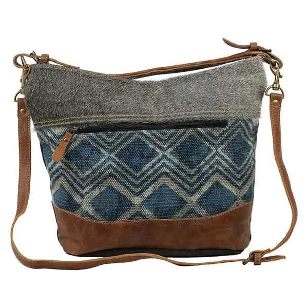 Casual and upscale, the Mid Town Shoulder Bag complements your ensemble on the go or out on the town. Made from upcycled materials, the chevron pattern in blues is contrasted by the medium tan leather trim and textured grey rug fabric.