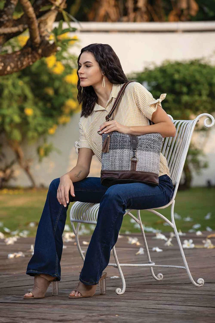 The Rough Textured shoulder bag highlights a sober rug design to complement your majestic personality. The front knuckle adds life to the soul of this chef-d’oeuvre. Environmentally responsible manufacturing using upcycled canvas, rug, and leather.