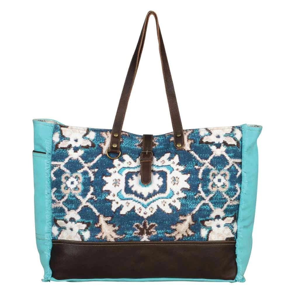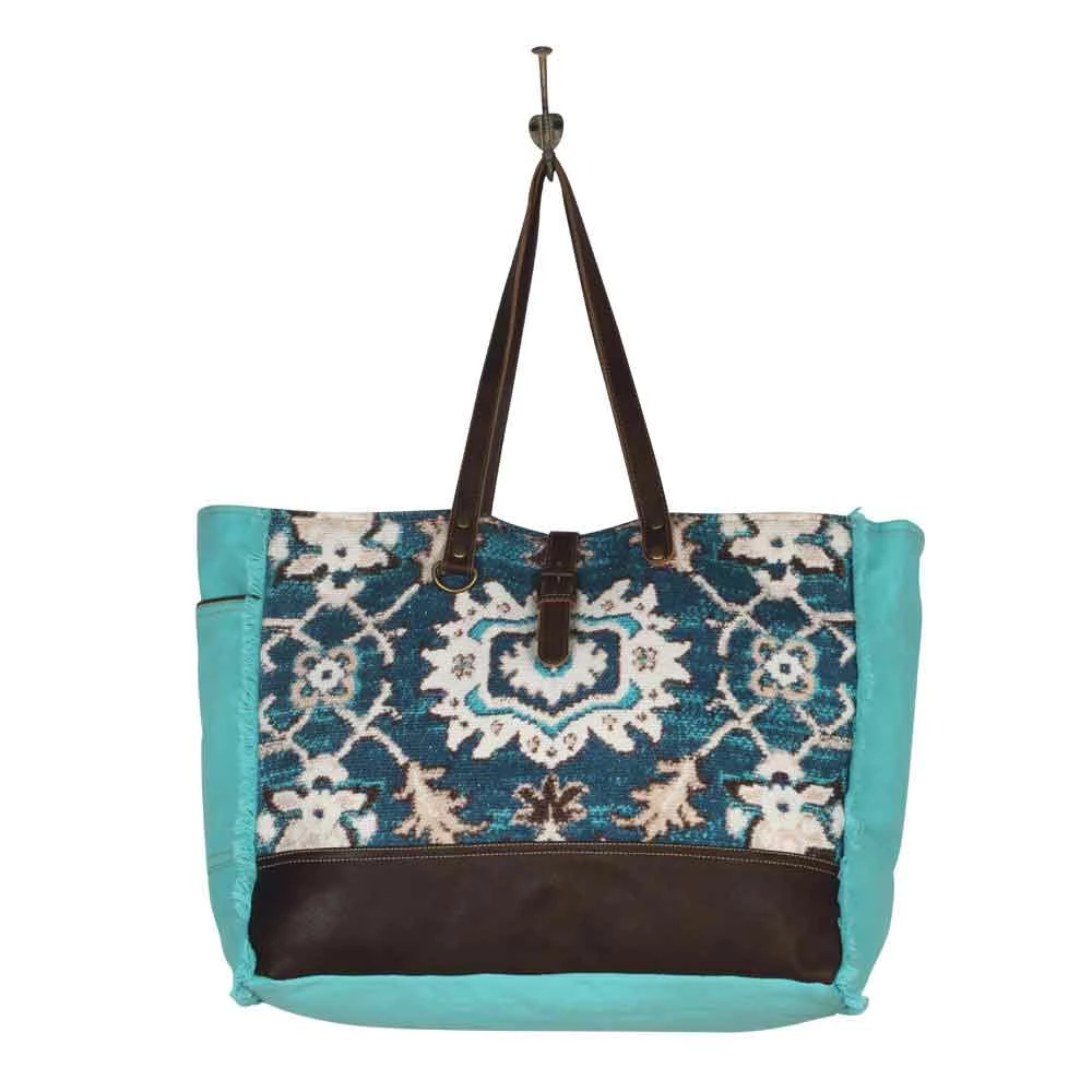 Lift up your spirit by making the Vivacious Weekender Bag a part of your everyday life. The upcycled weekender bag has vibrant edges combined with superbly designed rug and accented with leather panels.