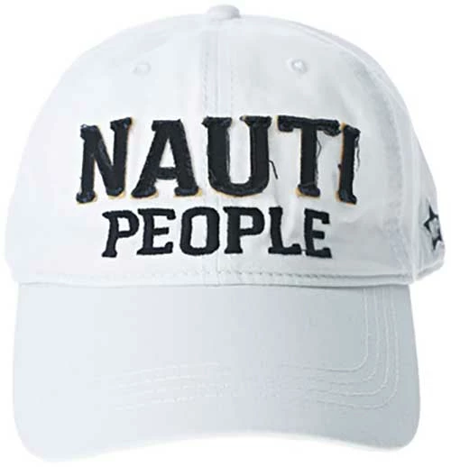 Nauti People have more fun and look great while sporting this white adjustable cap. 100% cotton baseball hat with adjustable strap in the back. “Nauti People” text is embroidered and sewn-in with a frayed edge. Show off your love for the water and let everyone know how Nauti you are!