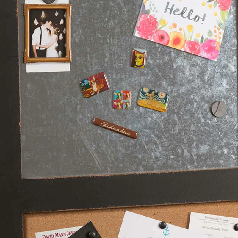 Keep your shopping list handy on the fridge with this artsy Chihuahua Magnet Set. The six piece set features the artwork of Gretchen Kish Serrano organized within a photo frame and a magnet with “Chihuahua” in script. A great gift for your favorite dog lover.